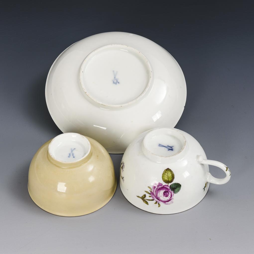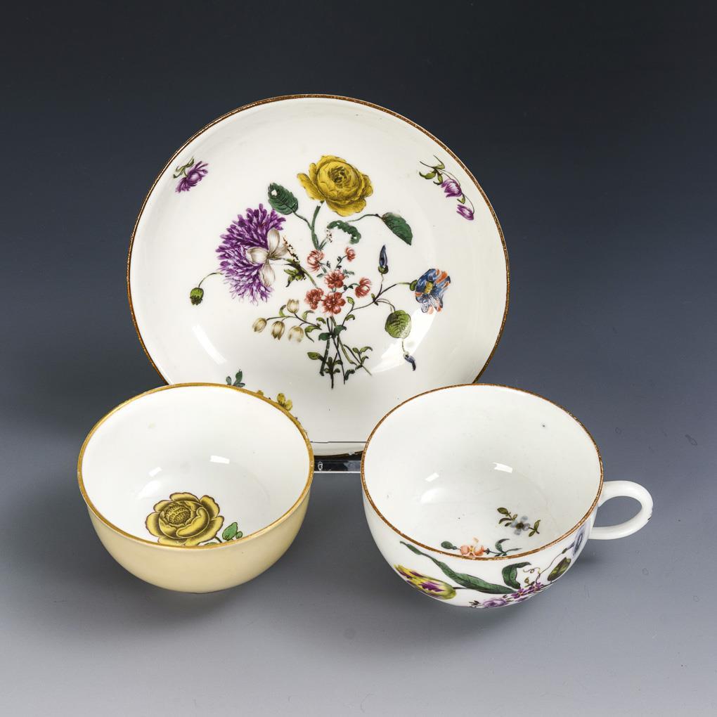 Polychrome painted, 1x gold-decorated. Cup (h 4.5 cm), saucer (Ø 13 cm), small bowl (h 4.5 cm).