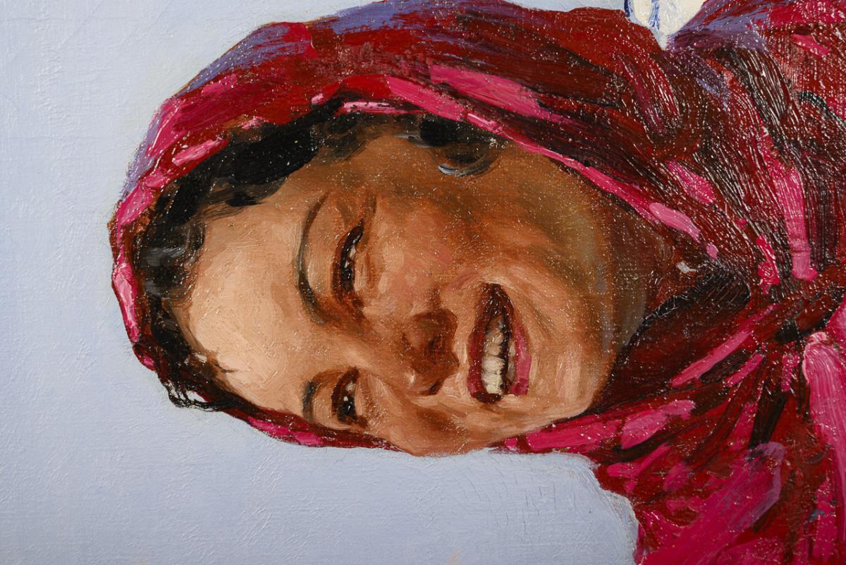 Joyfully laughing girl with a bright red headscarf in front of a snowy village landscape in the sunshine. Restored in heaven.