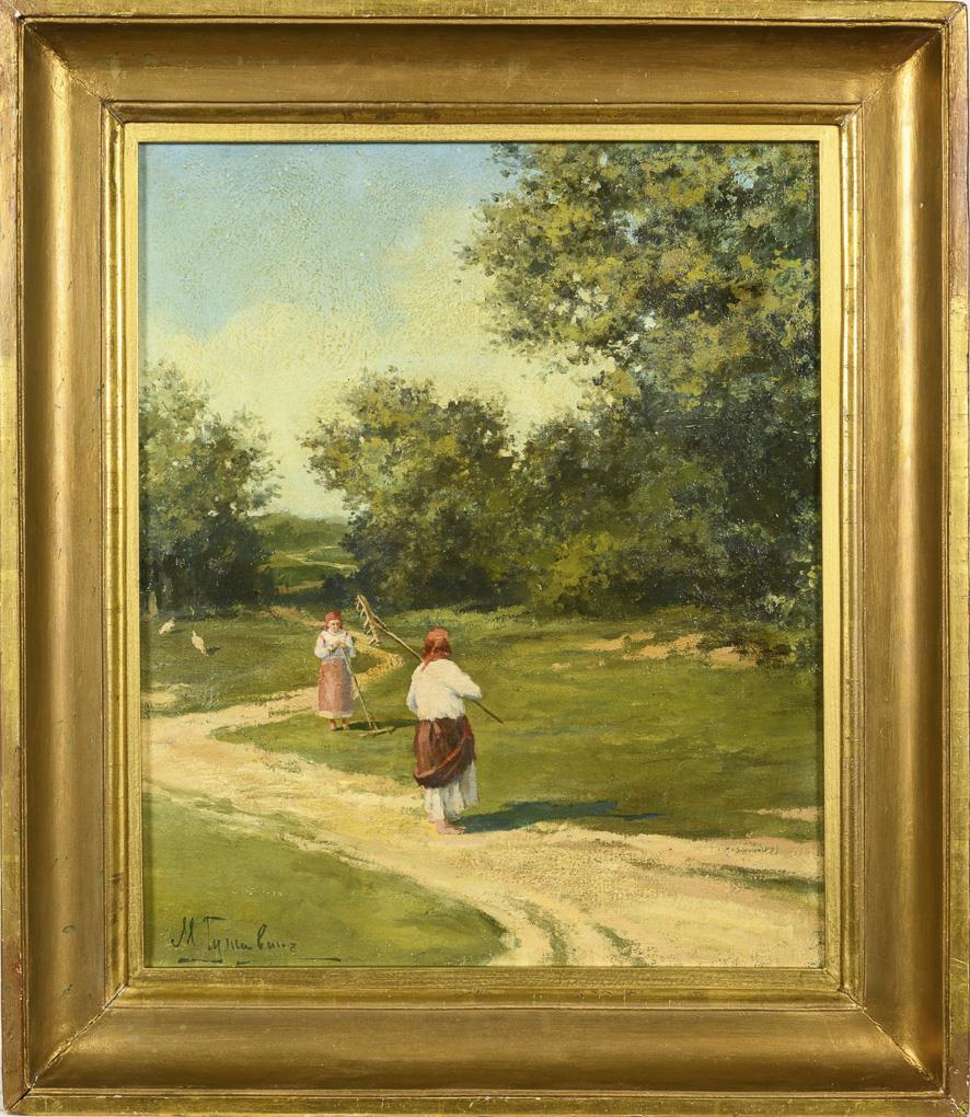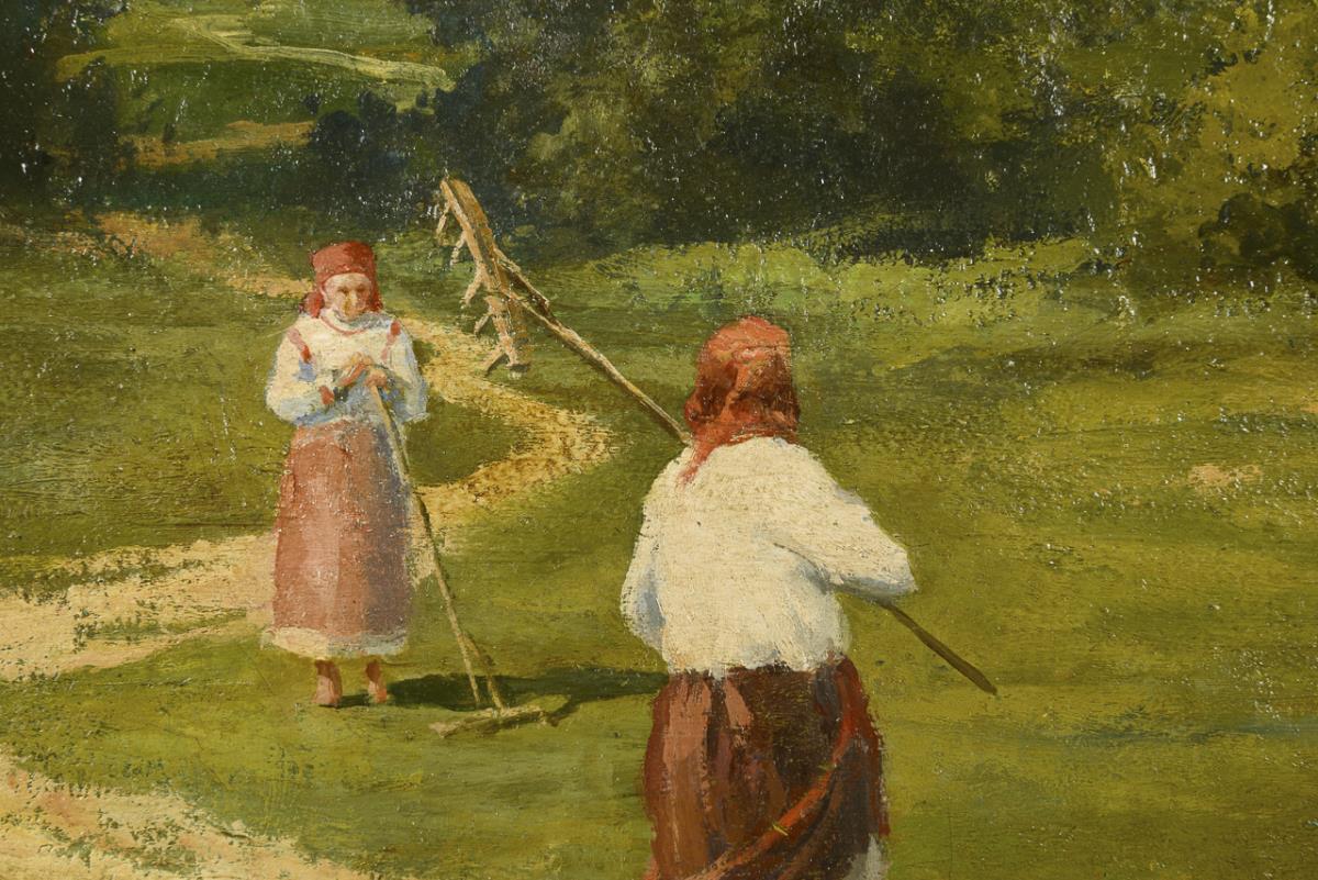 Two peasant women in the sunshine on a path with the rakes in the landscape. Minimal traces of age.