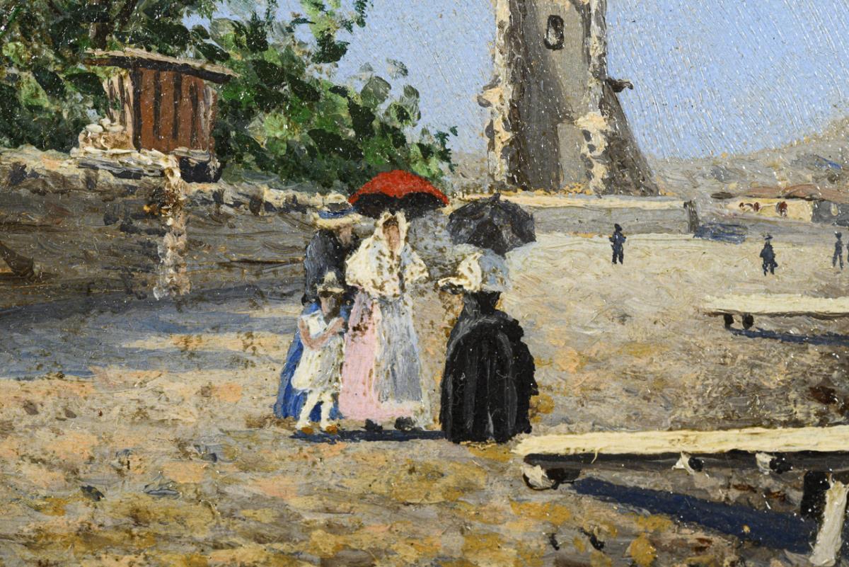 Staffage figures in the sunshine on a stony beach under a blue sky. Traces of age.