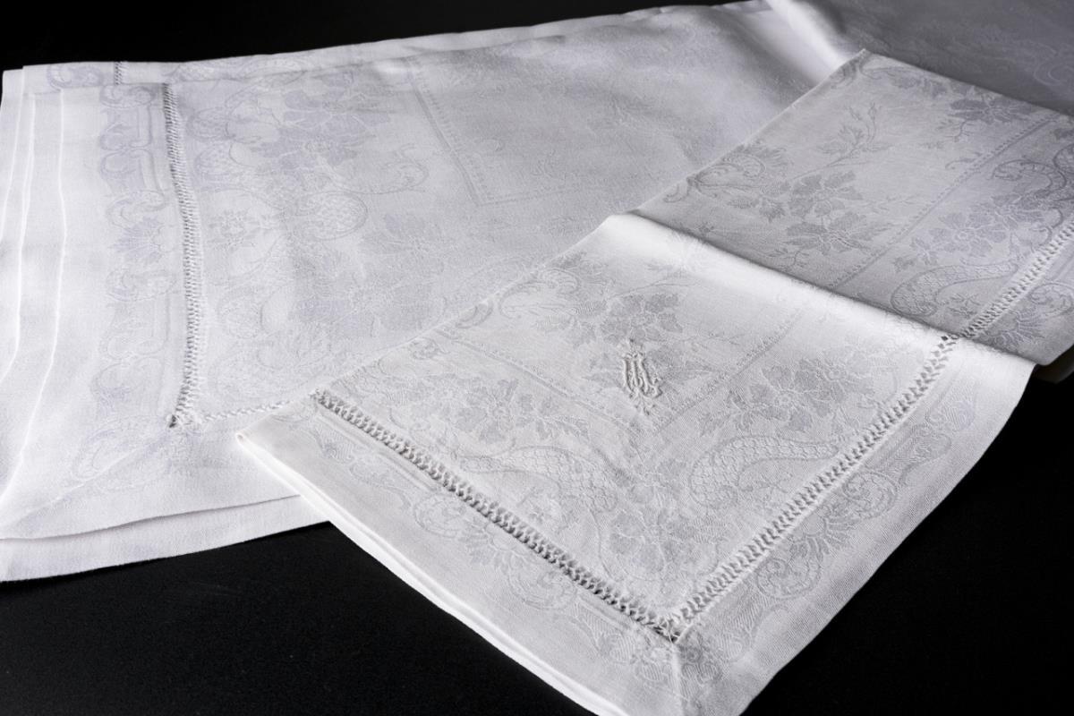 Cloths with floral and lattice vine designs, hemstitching and white embroidered monogram AL.