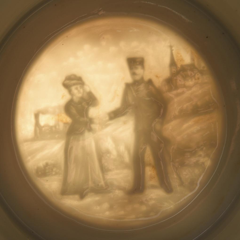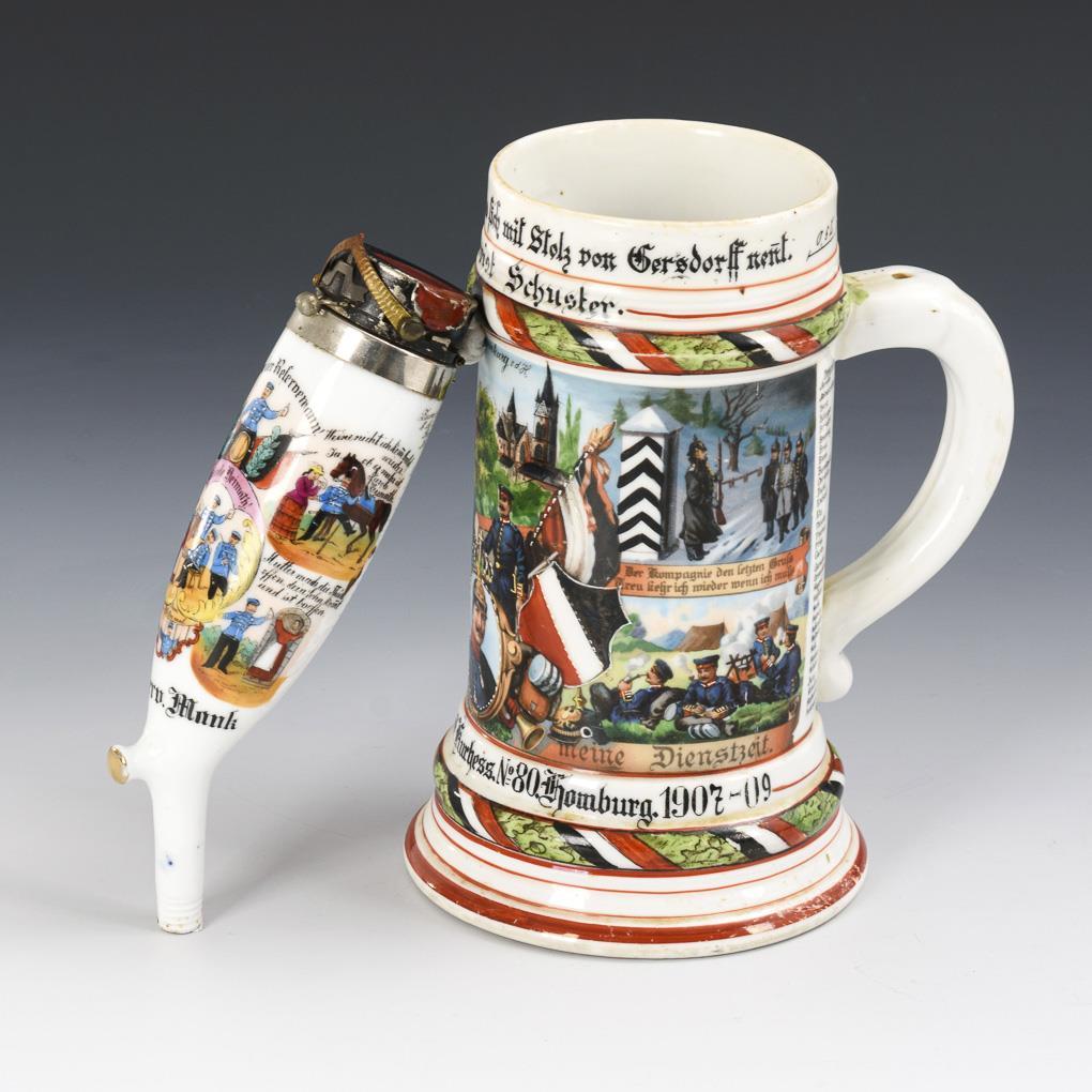 Reservist jug with portrait of Frederick II, city view, soldier scenes and mottoes. "Reservist Schuster, 11th Comp. Füs.Rgt. v. Gersdorff Kurhess. No. 80 Homburg 1907-09" and printed list of names. Lithophane: Soldier's farewell / pipe stub with jacket cover, soldierly scenes and sayings "Reservist Mank, 5th Escadr. 1st Hess. Hussaren Regiment König Humbert von Italien Nr. 13 Bockenheim, 1895/98" with painted list of names and signature "E. Bögelmann Colmar". Jug without lid, jug and pipe lid somewhat rubbed.