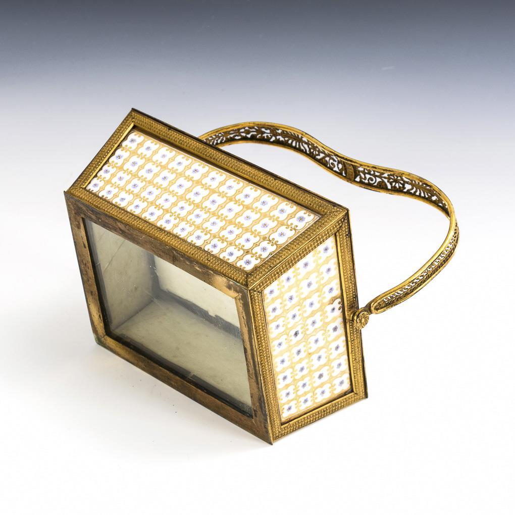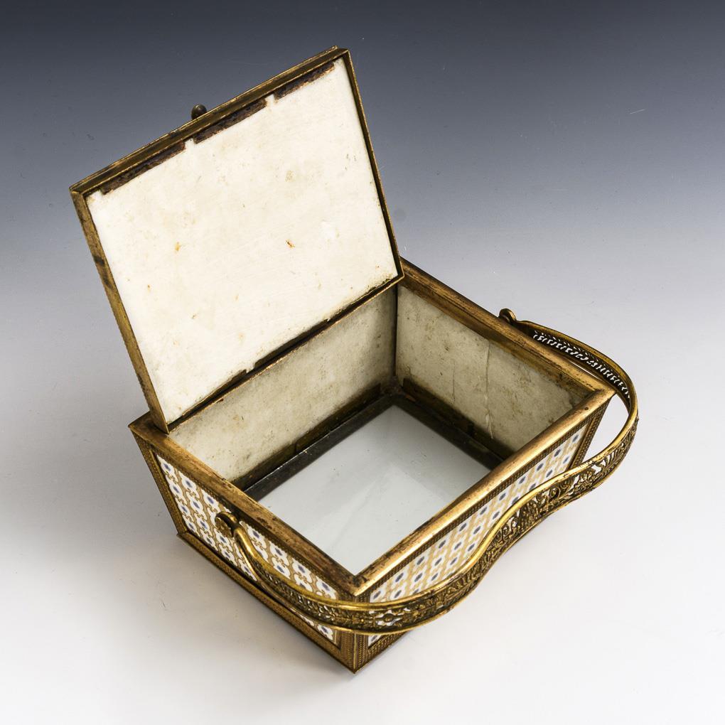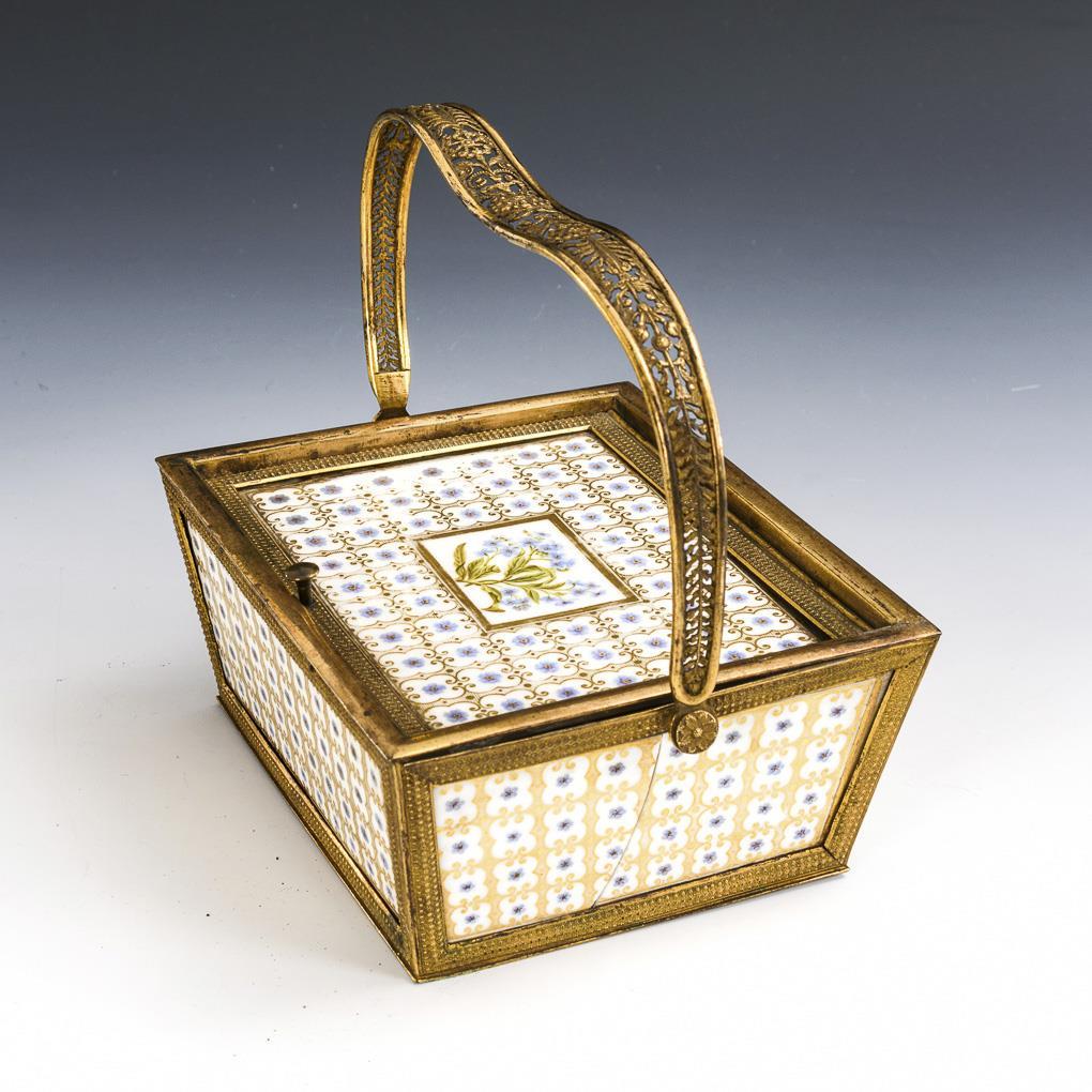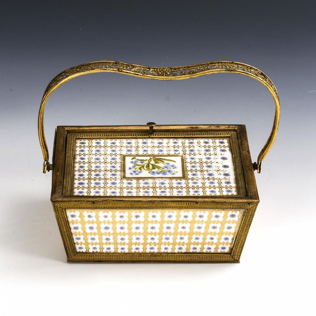 Rectangular-conical basket with brass frame and porcelain plates inserted into the lid and sides, with a glass plate inserted into the base. Porcelain with fine gold and forget-me-not painting. 1 porcelain plate defective.