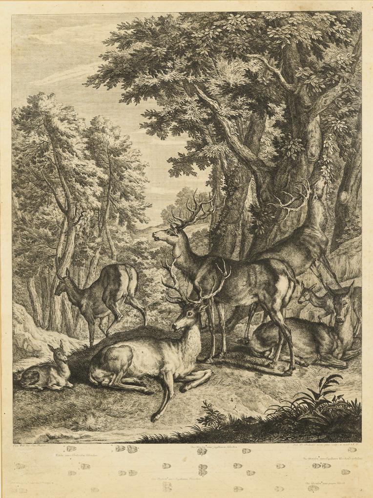 Characteristic depiction of stags in natural surroundings, with illustration of the tracks, in Georg Thienemann's "Leben und Wirken des unvergleichlichen Thiermalers und Kupferstechers Johann Elias Ridinger [...]", 1856. Foxspots and handling marks.