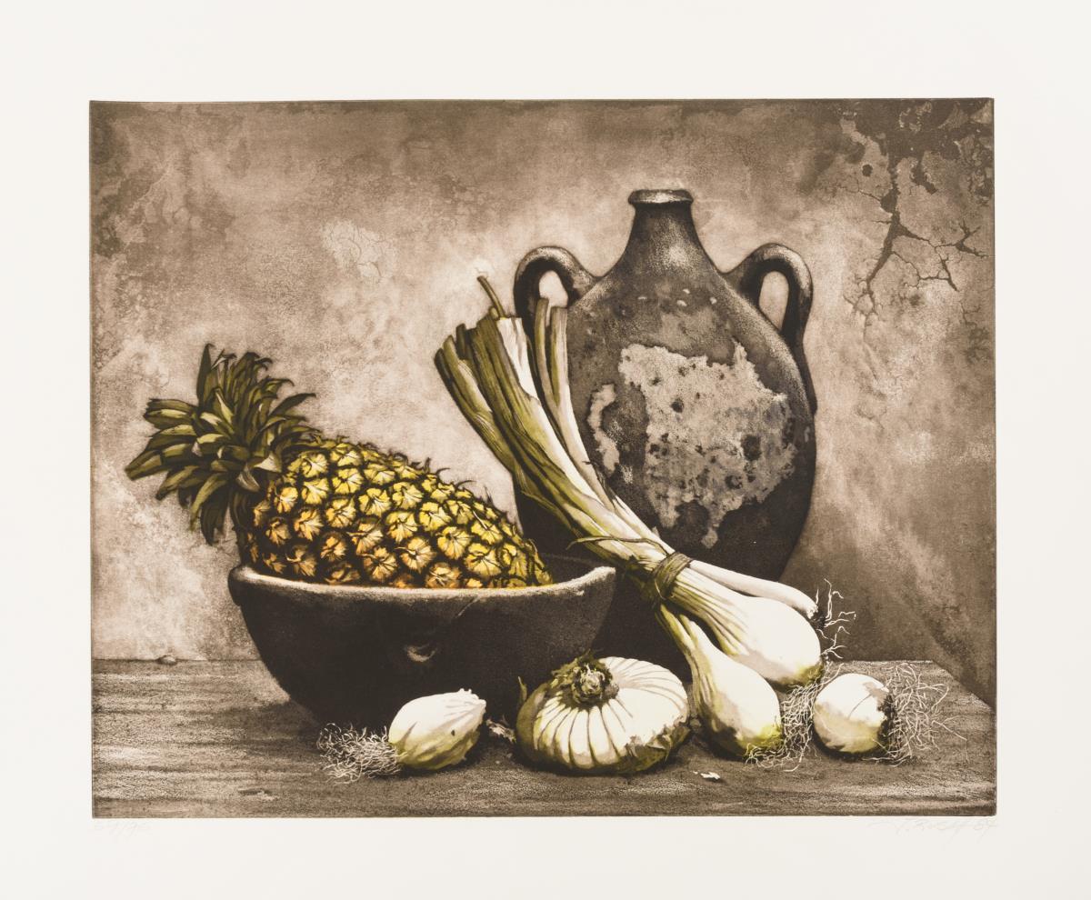 "Stillleben mit Flasche, Ananas und Zwiebeln"