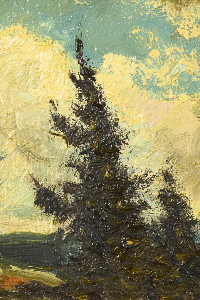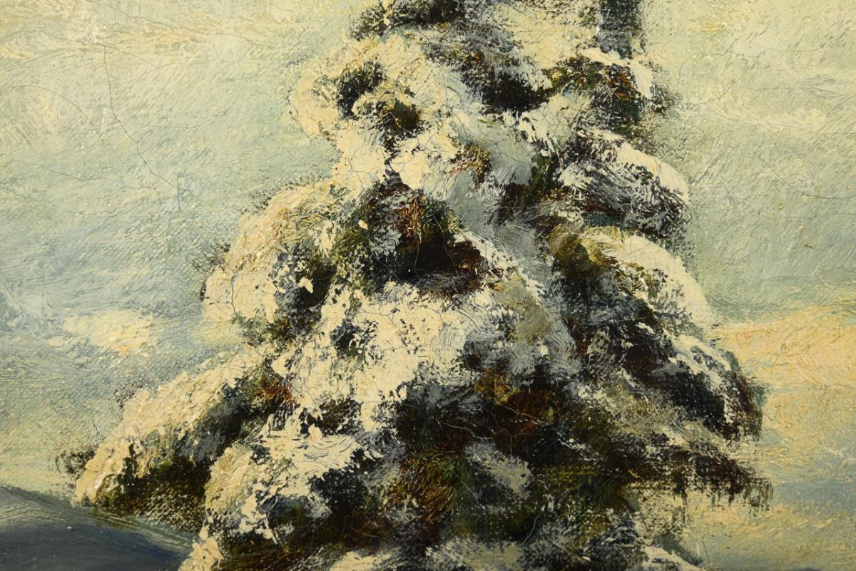 Snowy mountain landscape with fir tree and stream in the forest with sunlight streaming in and fir trees on a peak with a view over the landscape. Slight traces of age.