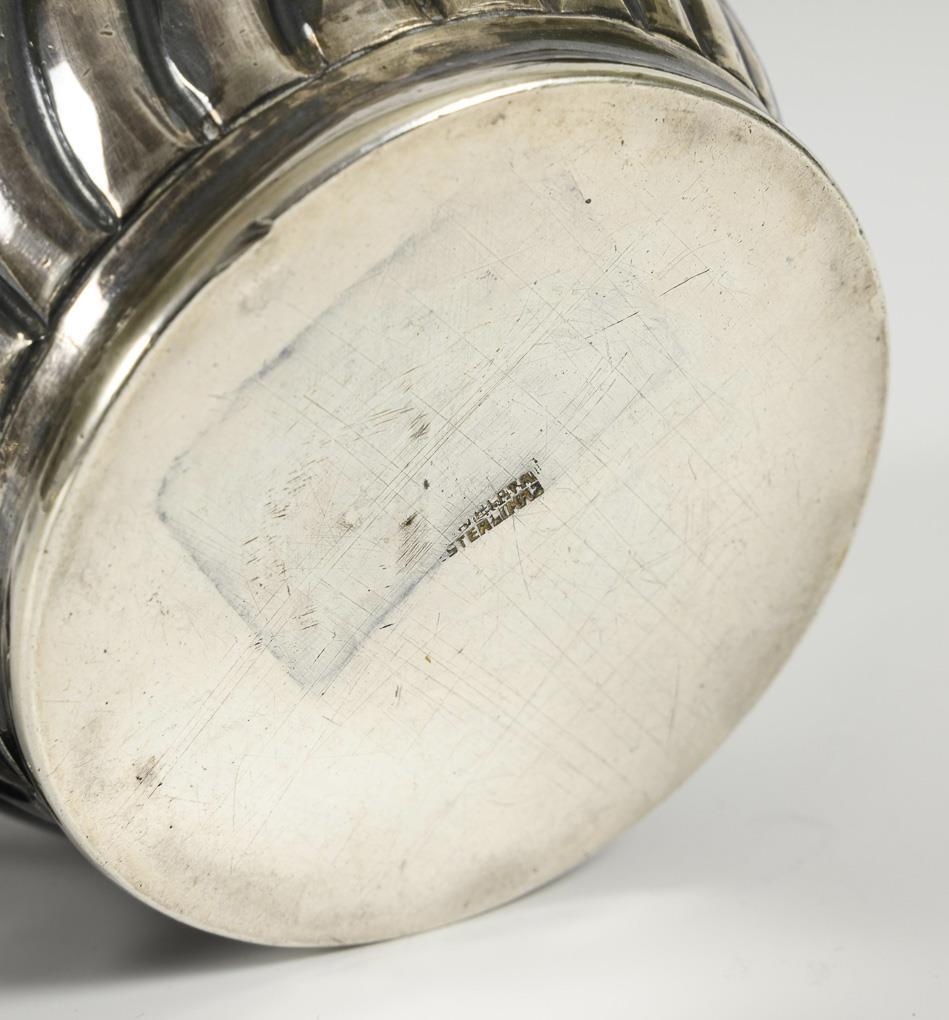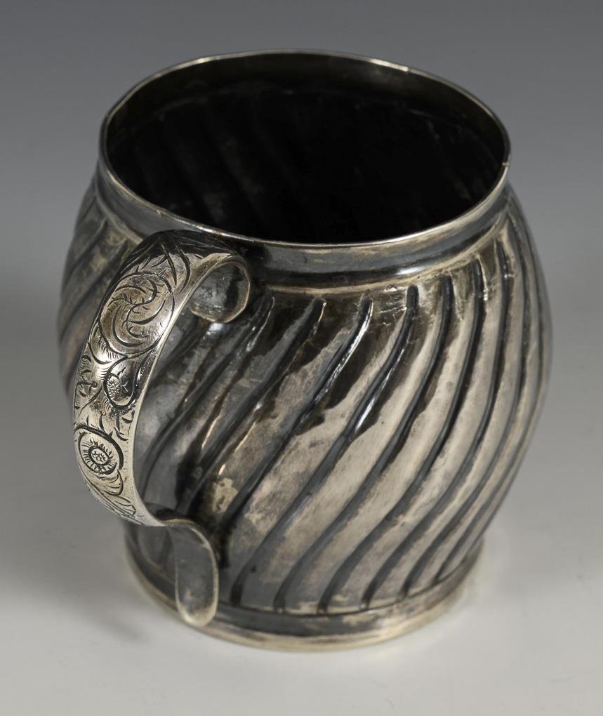 Slightly bulbous mug with twisted ribbed decoration. Wall dented, small crack at the mouth.