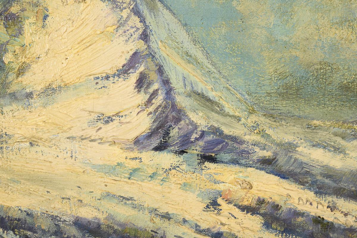 Winter mountain landscape with icy lake below the striking peak. One restored area with backing.