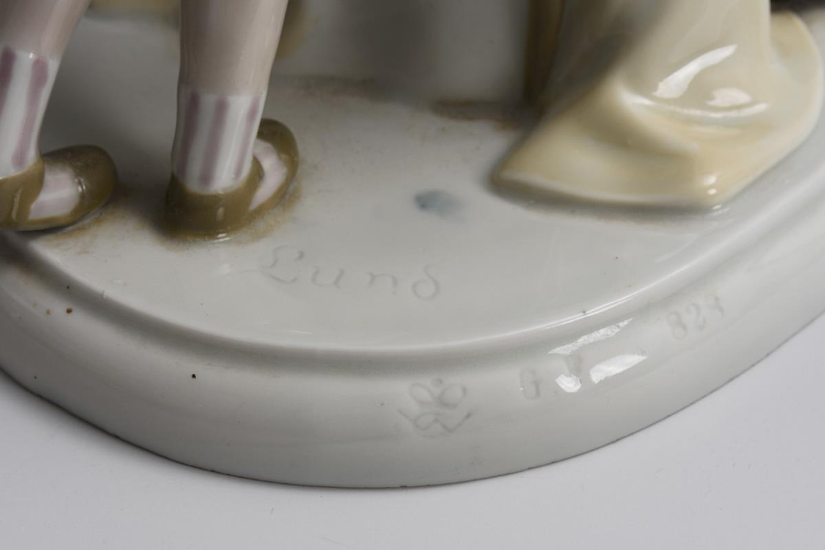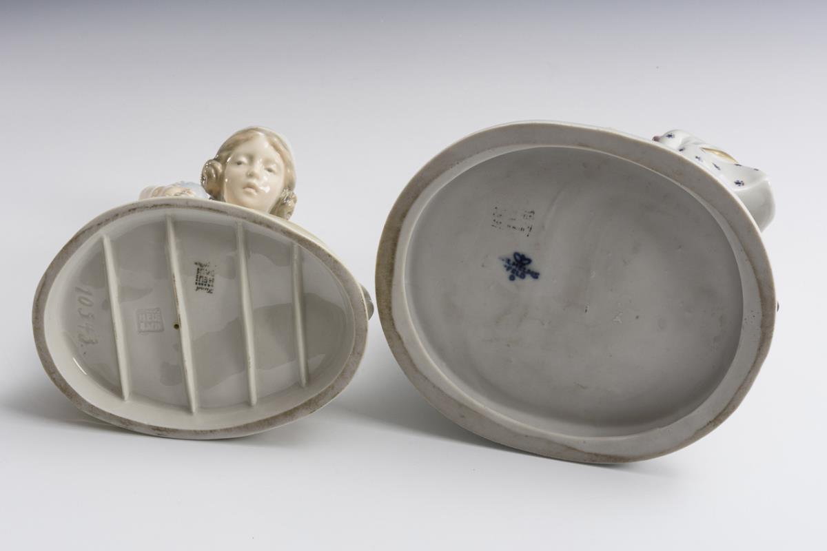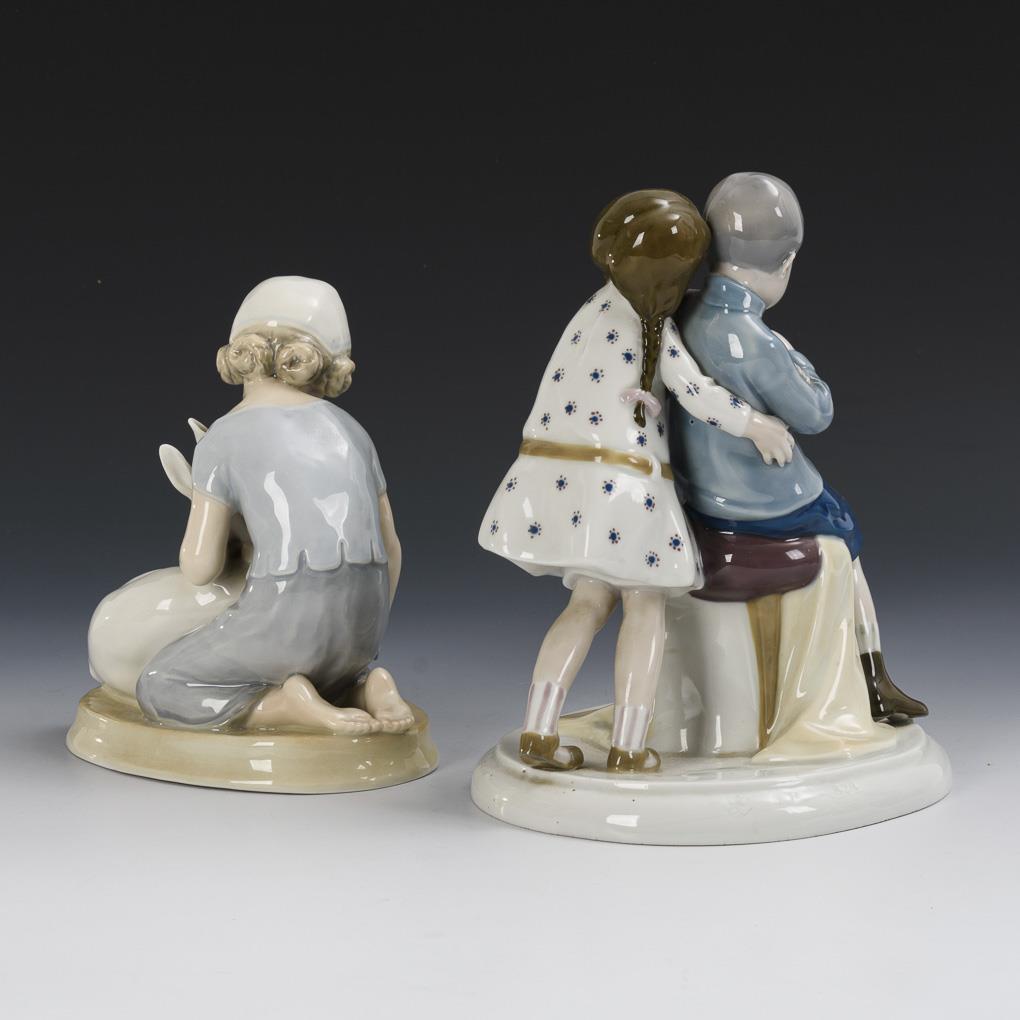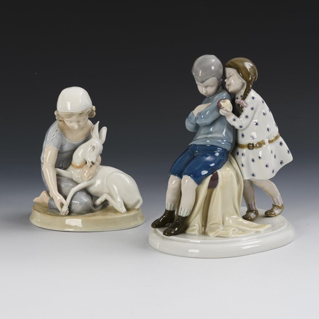 1x Heubach, 1905-1945, model no. 10543: Girl kneeling with a deer on an oval base, marked "Brüderlein und Schwesterlein" (H 16.5 cm) on the base. / 1x Goebel Wilhelmsfeld, 1919-1936, model no. 828, marked "Lund": girl handing an apple to a pouting boy (h 20.5 cm).