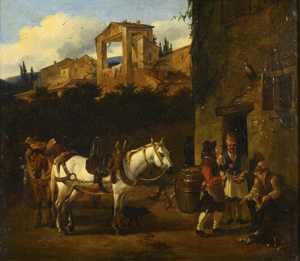 Genre scene with drinkers and a team of horses