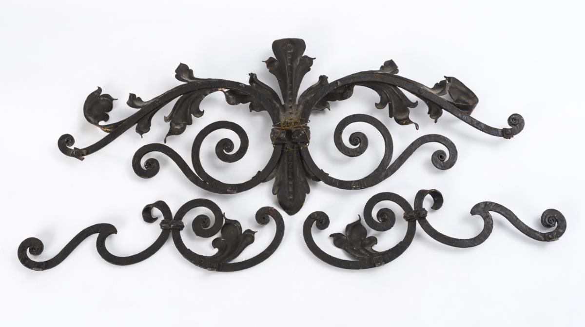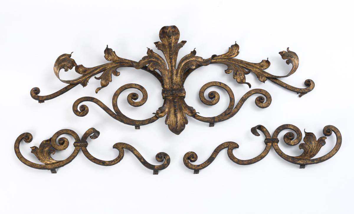 Wrought iron, gold-bronzed and varnished, riveted mounting straps. Maximum size 40 x 94 cm. Total weight 6.0 kg.