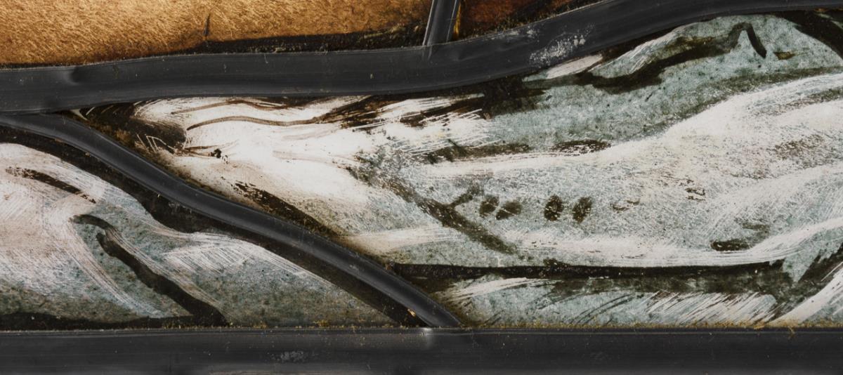 Clear and colored glass, partly ornamental glass, partly painted with enamel colors and black solder, lead rods. In total 68 x 85 cm.