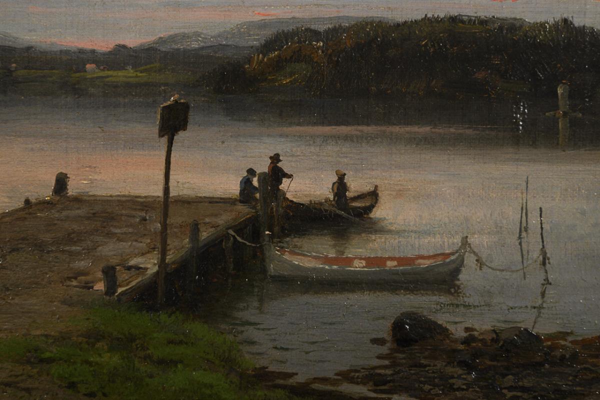 Staffage figures in the boat on the jetty in the evening after sunset. Canvas with doubled edges.