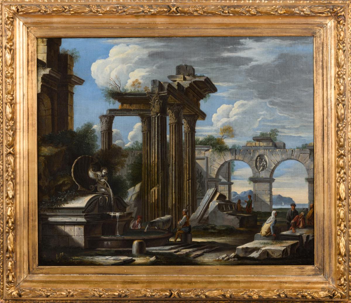 * ROBERTI, Domenico: Ruinenlandschaft mit Staffage. Öl/Leinwand, unsigniert, Ende 17. Jh. 63 x 77 cm, Goldstuckrahmen 81 x 94 cm. Bauernvolk zwischen den antiken Ruinen am Brunnen unter leicht wolkigem Himmel in Nähe der Küste. Eine restaurierte Stelle mit Hinterklebung. n Italienischer Landschaftsmaler (1642 Rom - 1707), Mitglied der Akademie San Luca. n Thieme/Becker. ABB.B263 Einlieferer: 3.000,- SG. Frank 29.10. 1 HK, 8x8cm, mittig links, retuschiert. Weitere kleine Retuschen am Rand des Bildes. Minimal krakeliert. Minimal verschmutzter Firnis. Interna: Beletage zzzzz ///Altmeistergemälde|Barock|Tiere|Antike 2004 in Paris bei Marcel Dassault erworben für 8000,-.