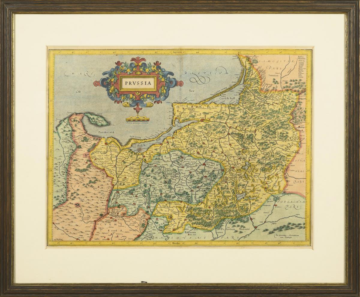 Richly colored, early map of Prussia, with scroll cartouche "Prussia"; from the so-called Mercator-Hondius Atlas "Atlas Minor À I. Hondio Plurimis [...]", 1606 -1633. Some handling marks.