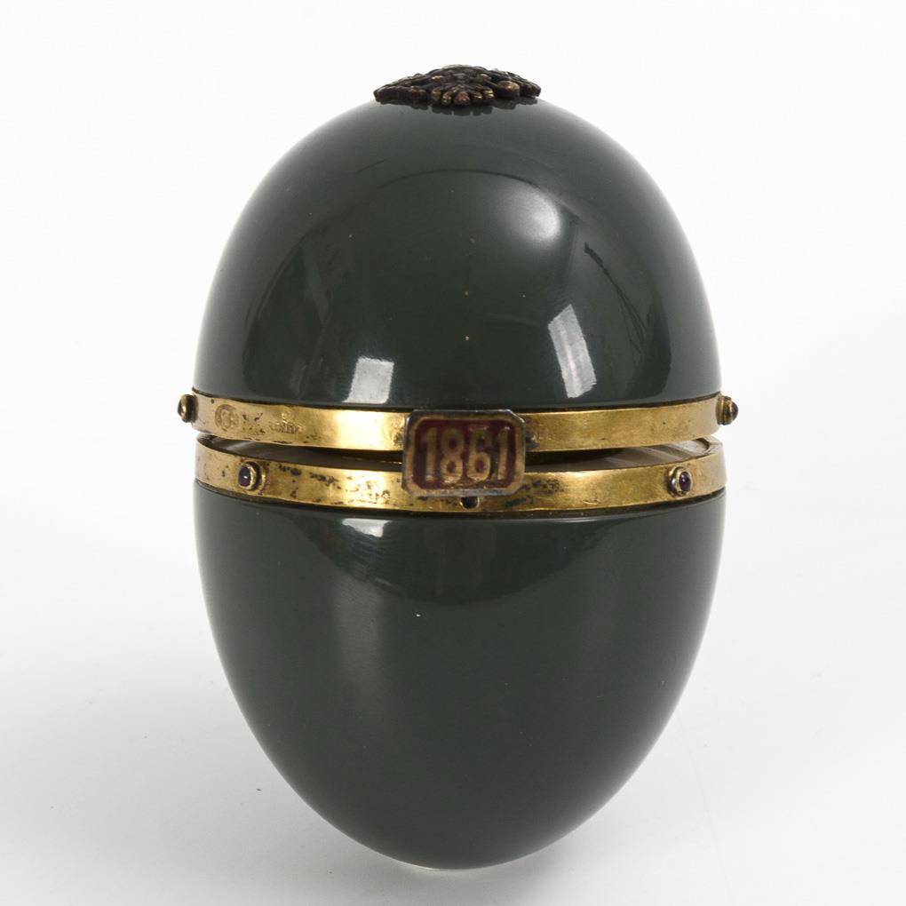 Egg-shaped box with applied eagle, inscribed with the year "1861" on the clasp and 6 small garnets on the mount. White inner rings around 2 hemispherical cavities of gilded silver. 1 white inner ring with hairline crack, missing part on the clasp.