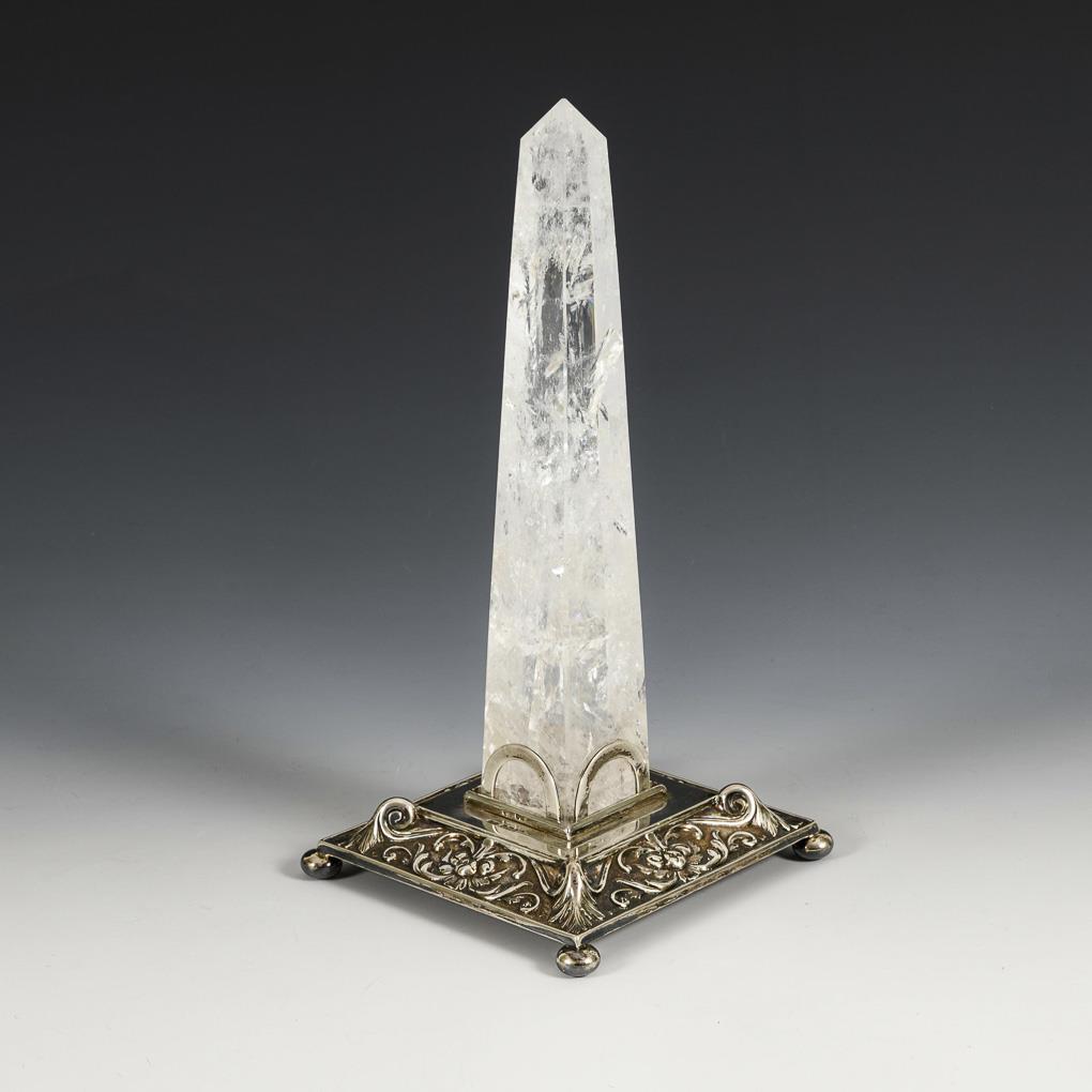 Rock crystal obelisk on English silver base with tendril reliefs. 1 corner of the obelisk broken off.