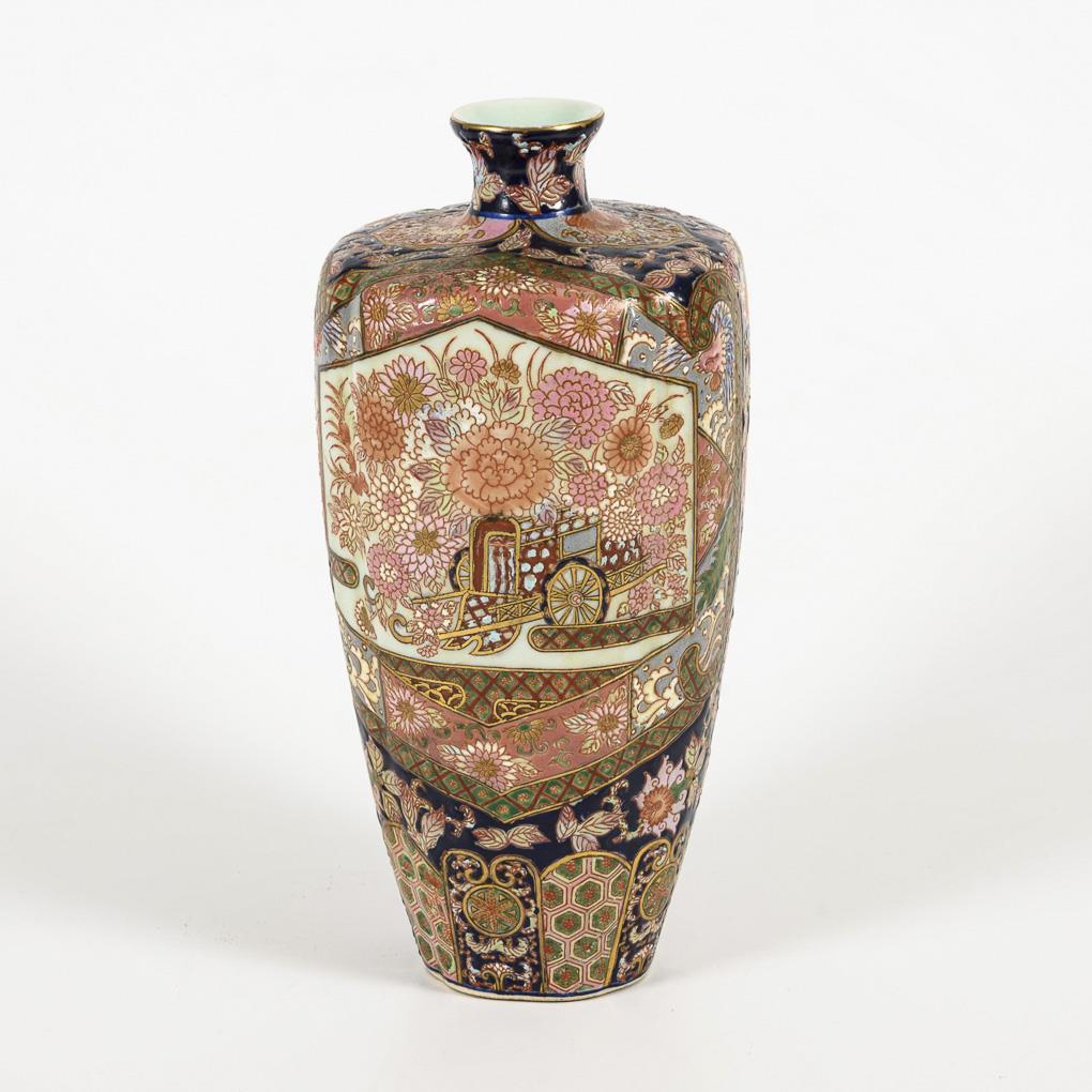 Six-pass baluster vase with rich enamel painting over a blue ground. The front decorated with flowers and a chariot, the back with a small flower cartouche. Glaze crackled and slightly discolored there.