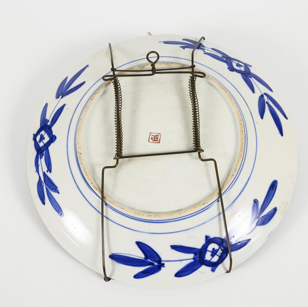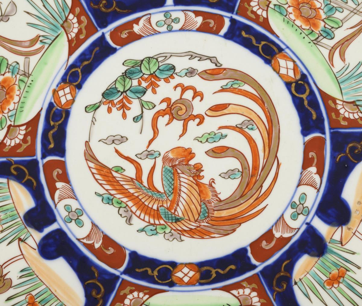 Phoenix with flaming ball in the mirror, surrounded by cartouches with small landscape pieces and birds. Underside with decoration in underglaze blue. Wall mount.