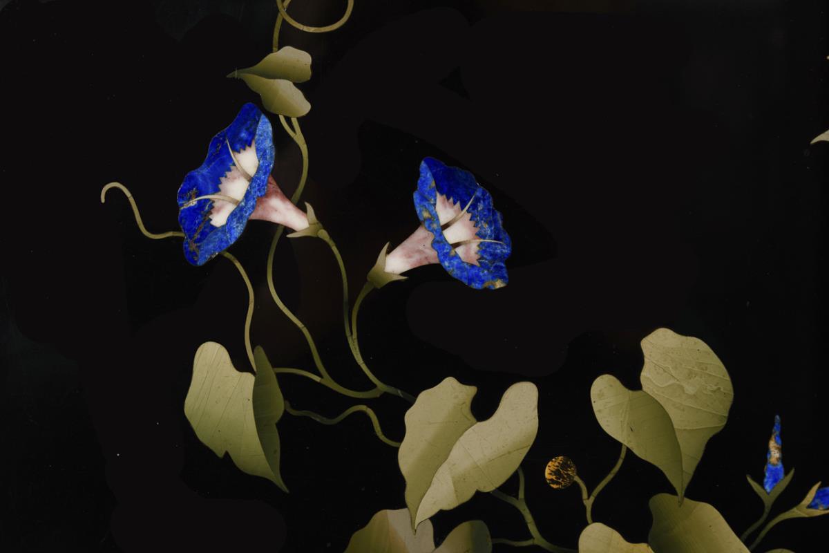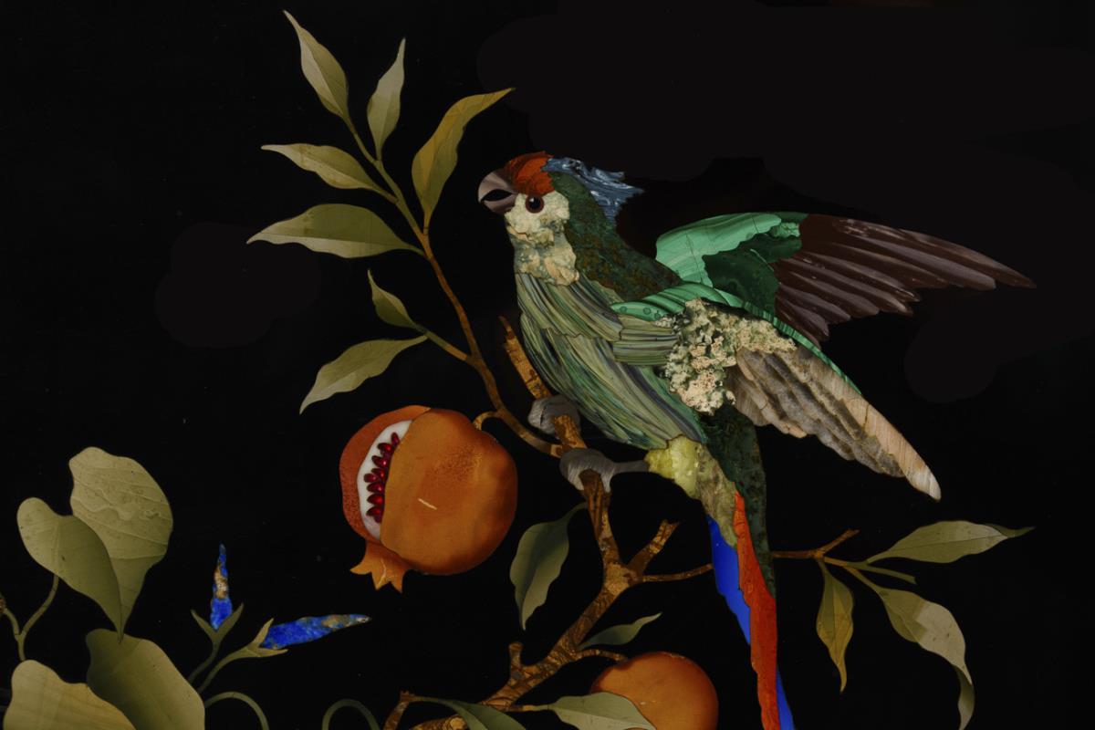 Also known as "Florentine mosaic" or "commesso fiorentino" pietra dura panel. Exceptionally fine work with a parrot on a branch with pomegranates and blue bindweed with flowers.