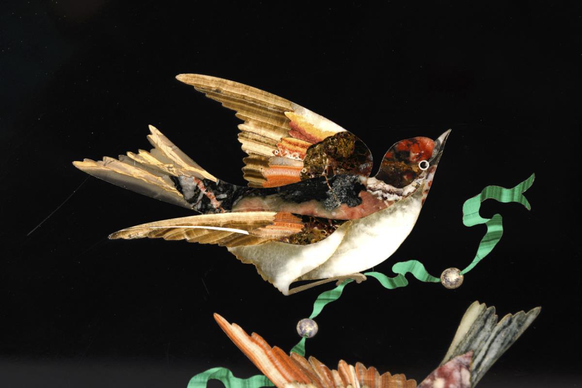Also known as "Florentine mosaic" or "commesso fiorentino" pietra dura panel. Colorful birds on a fluttering ribbon with clear "pearls". 2 minimal losses to the wing, minor losses to the rim.