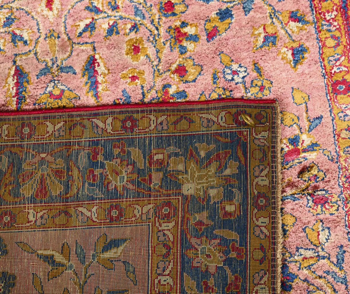 Pink-colored, florally patterned central field with various branches of flowers. Three-row border with floral tendrils. Eyelets for suspension on the reverse. Fringed edges repaired, probably replaced red edge wrapping.