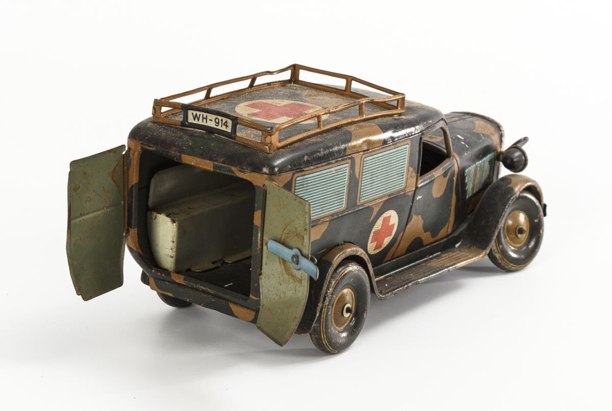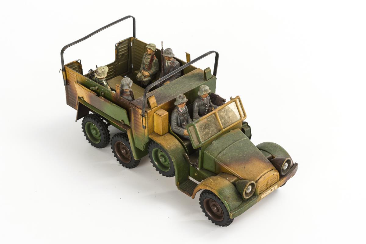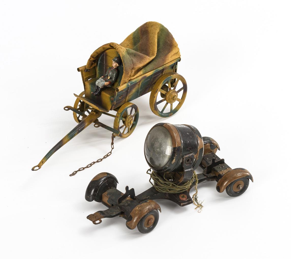 Personnel carrier with 6 figures (with intact clockwork drive), ambulance car (with defective clockwork drive), armored car with cannon (with intact clockwork drive), headlights on trailer, trailer with fabric top and children's cannon "IMO" in original box. With defects.