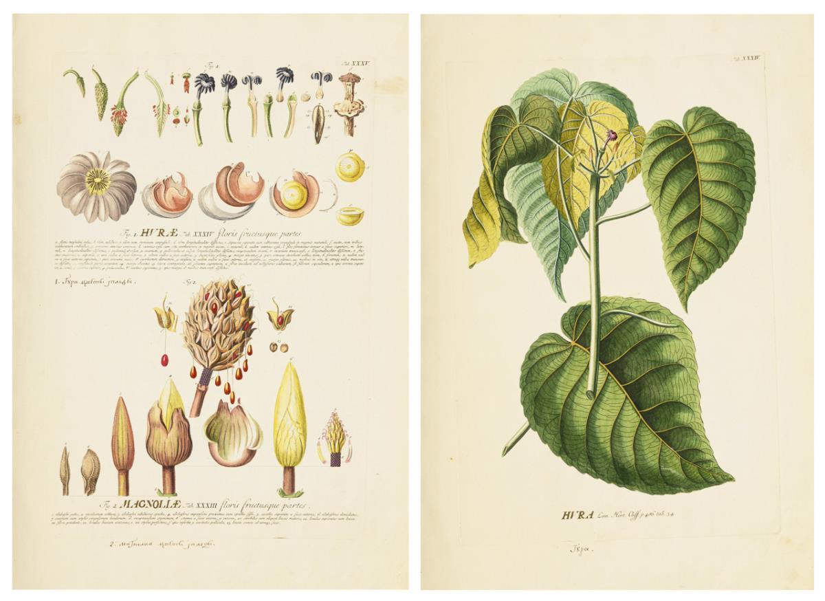 Plate XXXIV "Hvra Linn. Hort. Cliff. P.486. tab.34" | Plate XXXV "Fig. 1. Hvrae floris fructusque partes "and "Magnoliae Tab. XXXIII floris fructusque partes" (on one sheet) with ink inscription in Greek by an old hand, engraved by Johannes Jacob Haid; from Christoph Jacob Trew's "Plantae selectae quarum imagines ad exemplaria naturalia Londini, in hortis curiosorum nutrita", 1750 - 1773. Some spotting and handling marks.