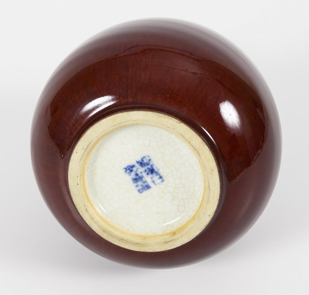 Drop vase with monochrome glaze, only the upper rim is light glazed. Traces of production can be felt. Glaze with few, small production flaws. Bottom with mark brightly glazed, with crackle.