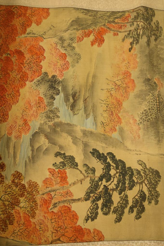 Ink drawing on silk, mountain landscape with red colored trees. Slight traces of age, slightly torn at the bottom of the scroll bar.