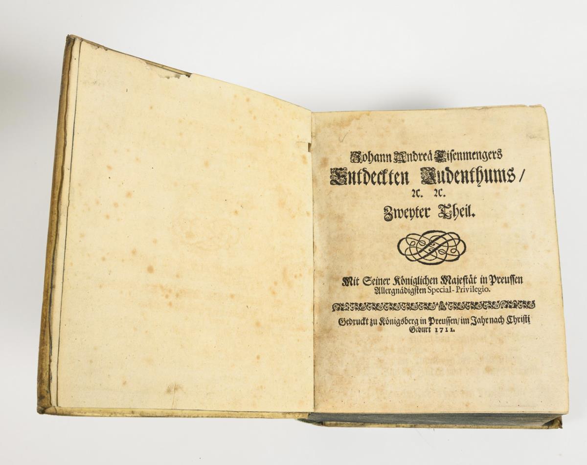 Famous and notorious anti-Judaicum, the first edition of which was initially prevented in 1700. Numerous quotations in Hebrew and Greek in the text. Each with bookplate by Benjamin Daniel Itzig. Contemporary vellum bindings with spine title. Forwards somewhat foxed, text block browned, bindings with a few traces of age/use (1 tear at the bonnet).