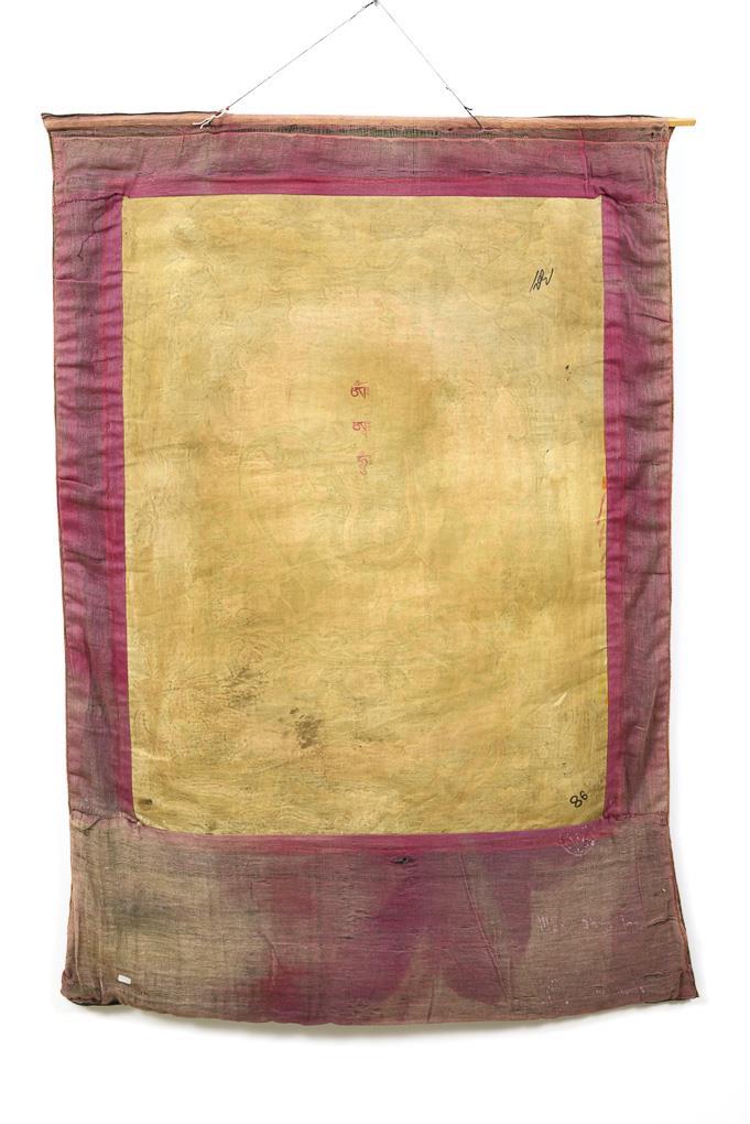 Dark blue, dancing deity with fire aura, surrounded by lotus blossom and birds. Oil paint on fabric, framed by green silk fabric with characters.