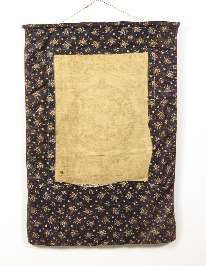 Mandala with Yamantaka and Vajravetali in the center, surrounded by numerous Buddhas and demons. Framed by wine-red silk fabric with characters.