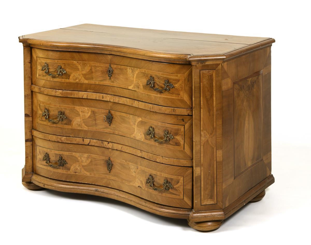 3-tier, curved chest of drawers on flattened ball feet, finely decorated with coffered burl veneer and ribbon inlays, rocaille bronze fittings. Restored, fittings replaced, signs of age/use.