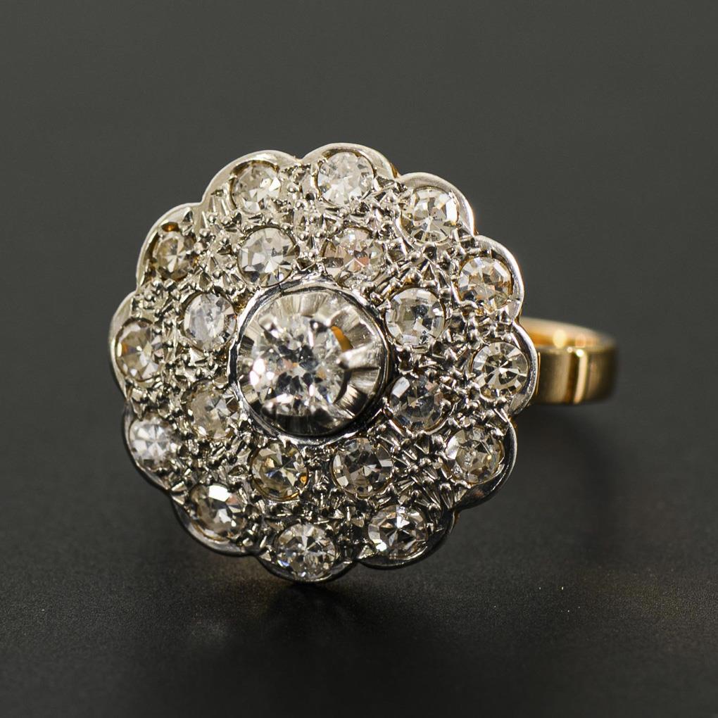 Yellow gold/white gold 18 kt indistinctly stamped, tested. Brilliant approx. 0.25 ct/G-H/si-PI. Diamonds in total approx. 1.50 ct/H-J/vs-si. Ring size 54. 5,5 g.