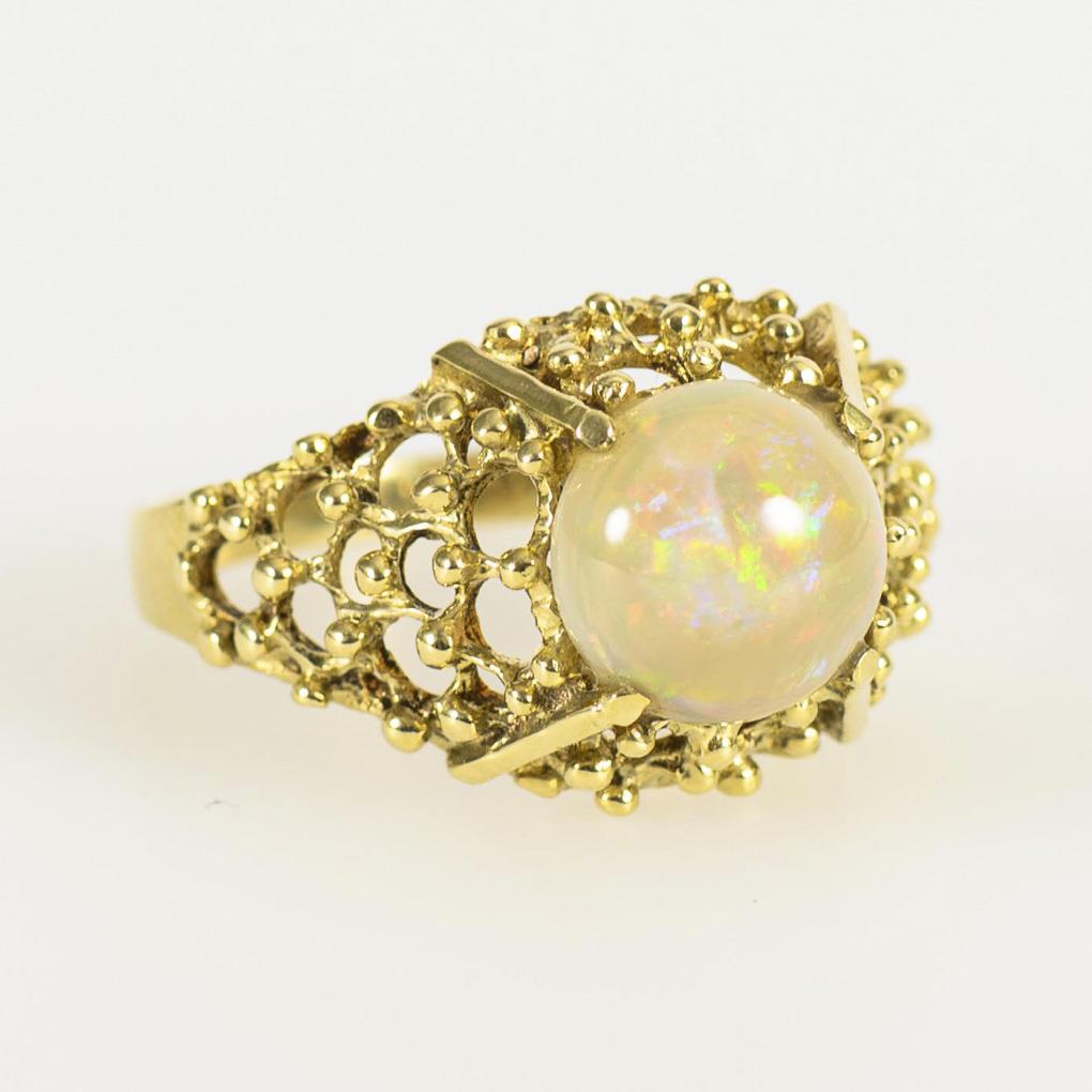Claw-set cabochon in grid-like ring center between narrow shank.
