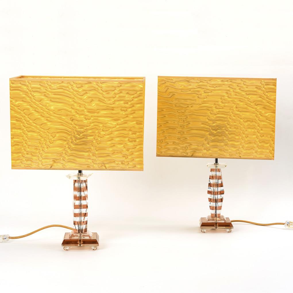 Table lamps designed in the style of Jacques Adnet, Baccarat. Plinth standing on ball feet, rhombic cut column shaft with abacus. Single-flame screw socket in a rectangular yellow shade with an optical wave structure. Wired for disciples.