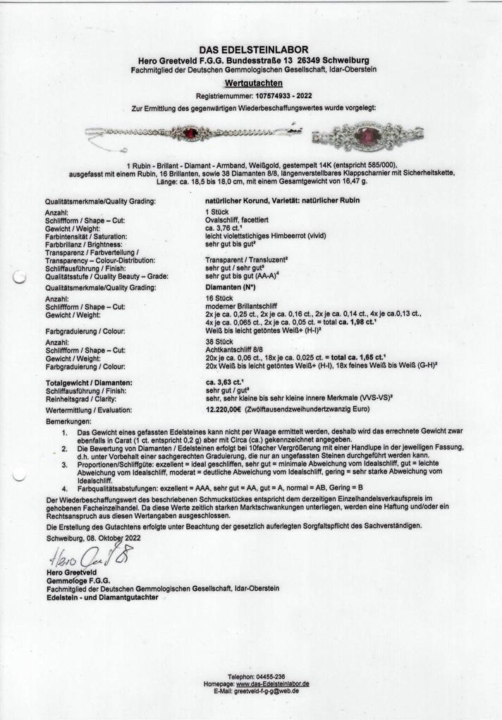 Stamped 14 K white gold. Ruby approx. 3.76 ct. Diamonds in total approx. 1.98 ct/H-I/. 38 diamonds in total approx. 1.65 ct/G-Hvvs-vs, L 18.5 x 1.5 cm (center). 16.5.