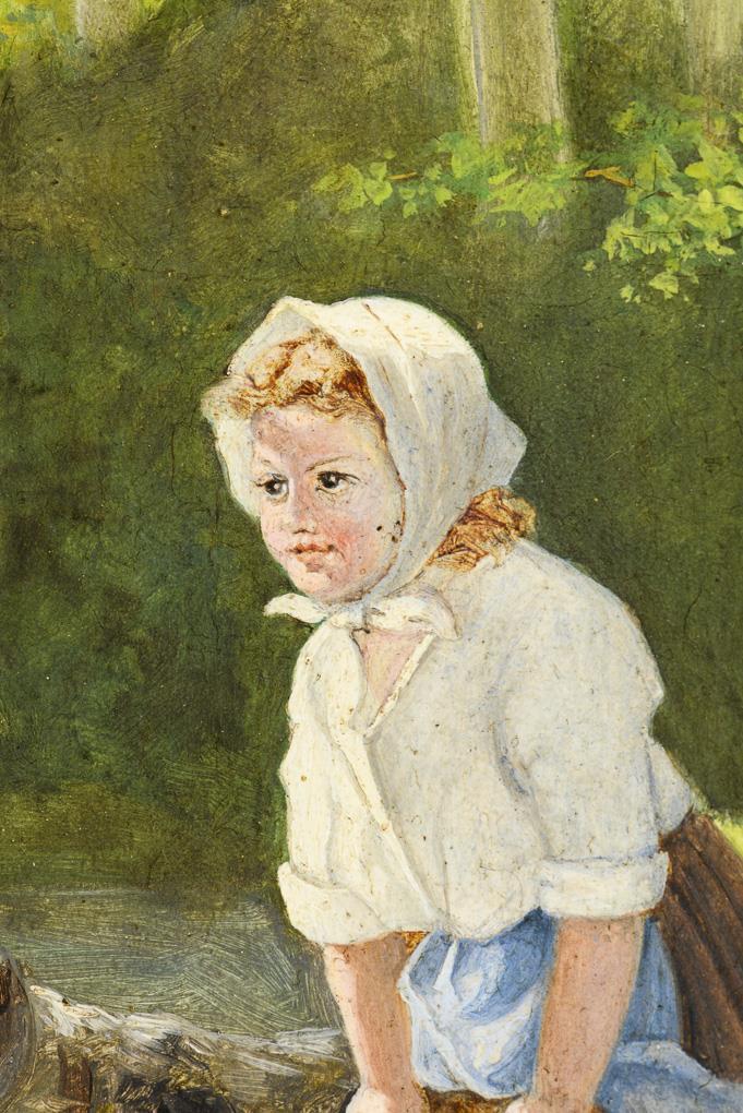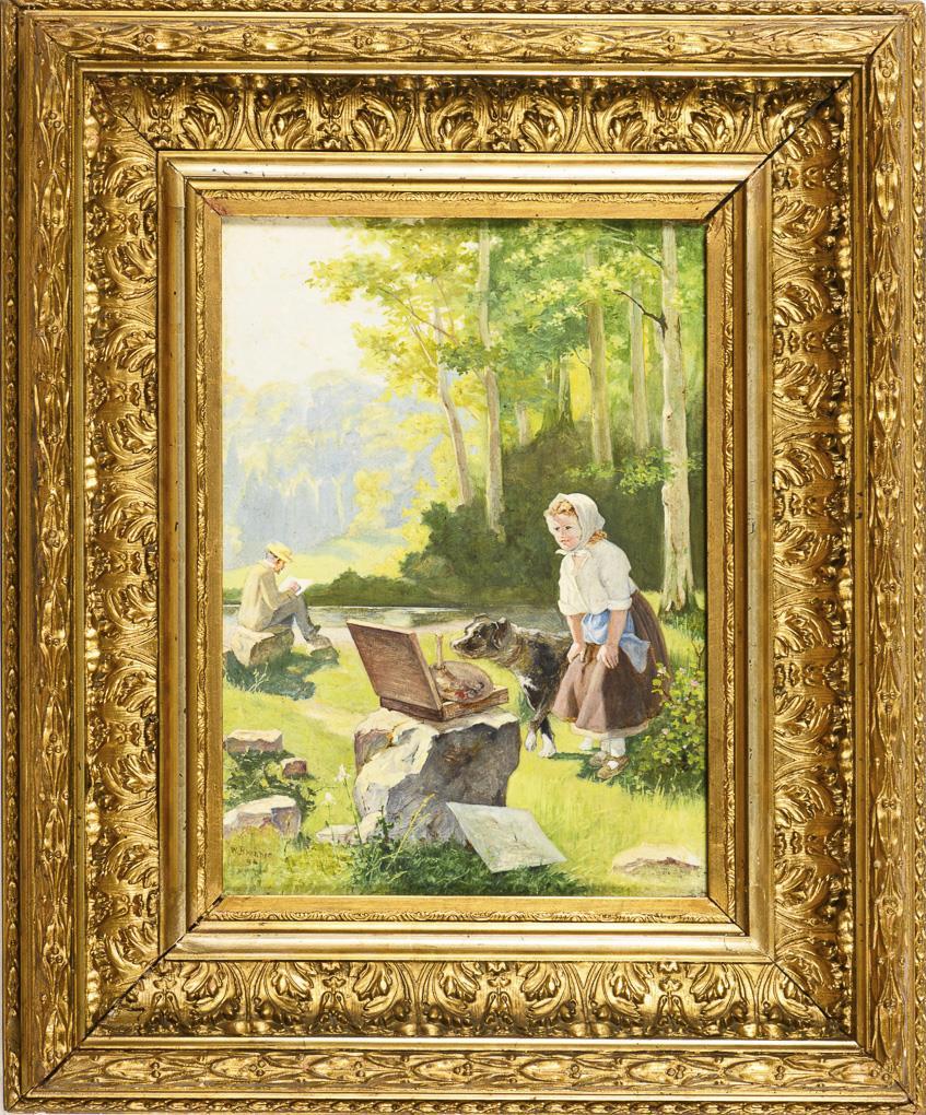 Curious girl with dog at an artist's paint box near the river at the edge of the forest. Minimal traces of age.