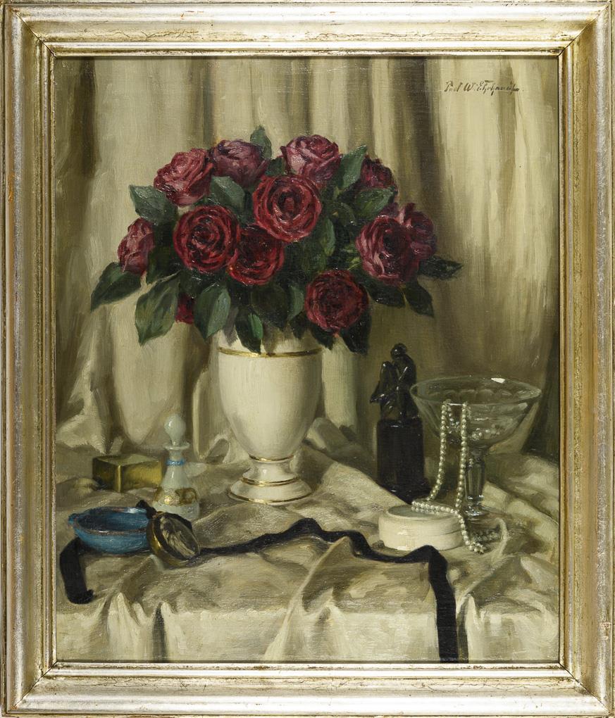Bouquet of roses in a white and gold porcelain vase next to a flask, casket and pearl necklace in a bowl in front of a white curtain.