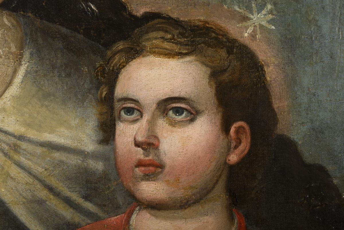Mary with starry nimbus and the boy Jesus on her lap. Canvas relined.