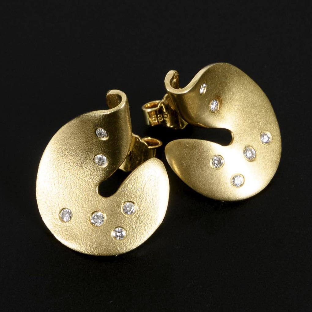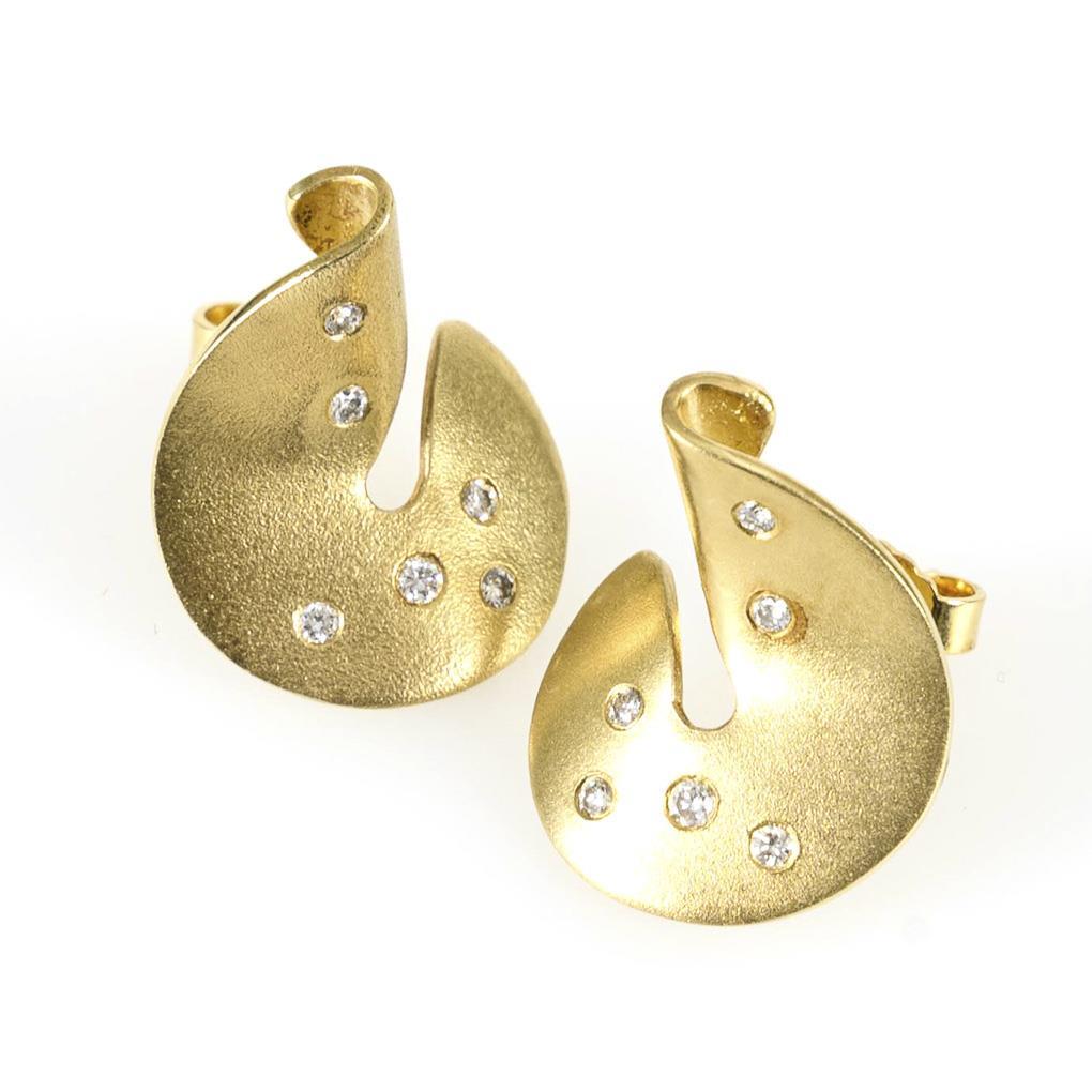 Sculptural disk-shaped band, each with 6 small, embedded diamonds. Push-in mechanism.