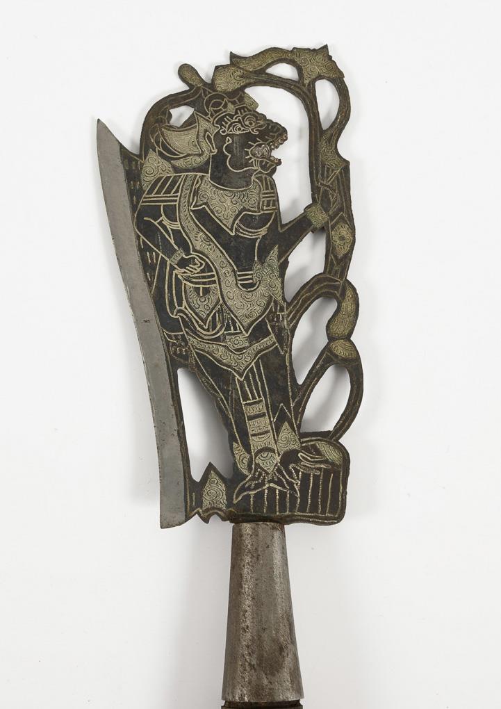 Openworked blade with demon depiction in Kofgari technique. Wooden handle.
