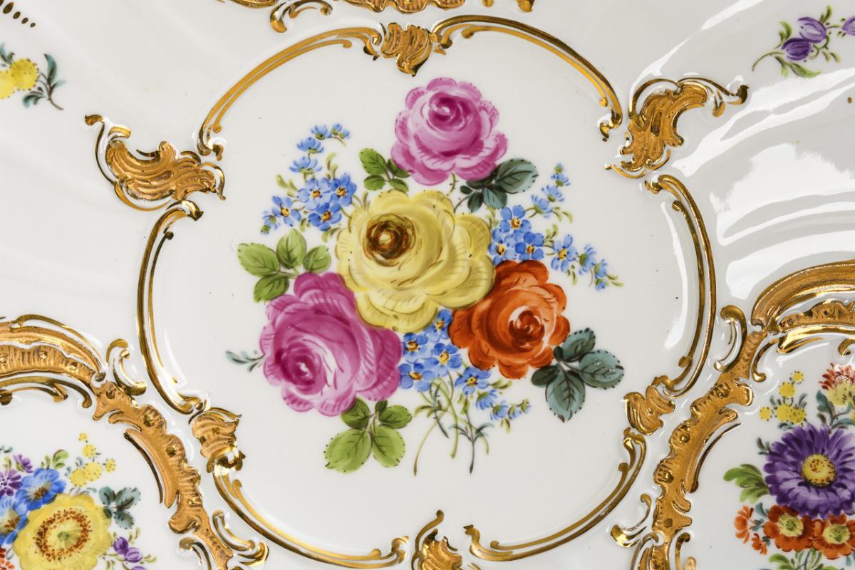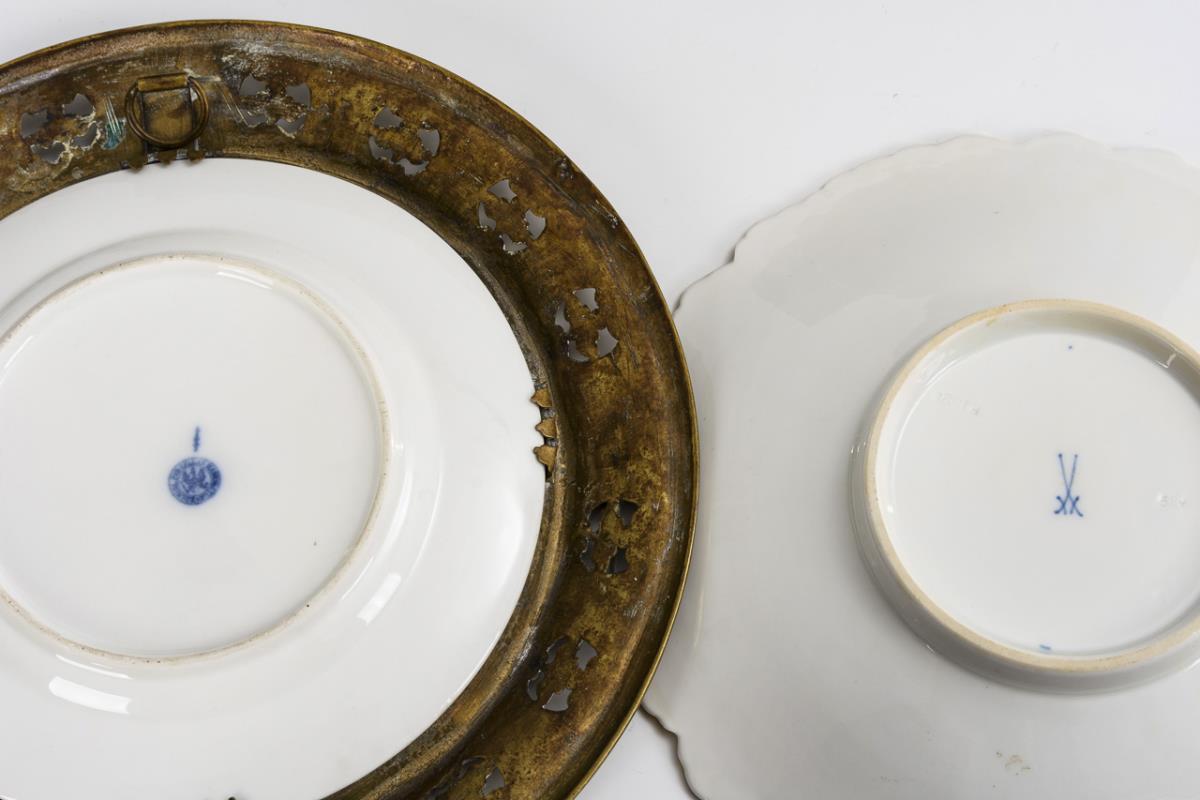 1x Meissen, 2nd half 20th century, 2 grinding marks: A magnificent plate with gold bronzing and flower painting (Ø 23.5 cm). / 1x KPM Berlin, sceptre mark and penny mark, 1849-1870: smooth plate with turquoise flag, floral painting and pierced brass frame (Ø 27 cm).