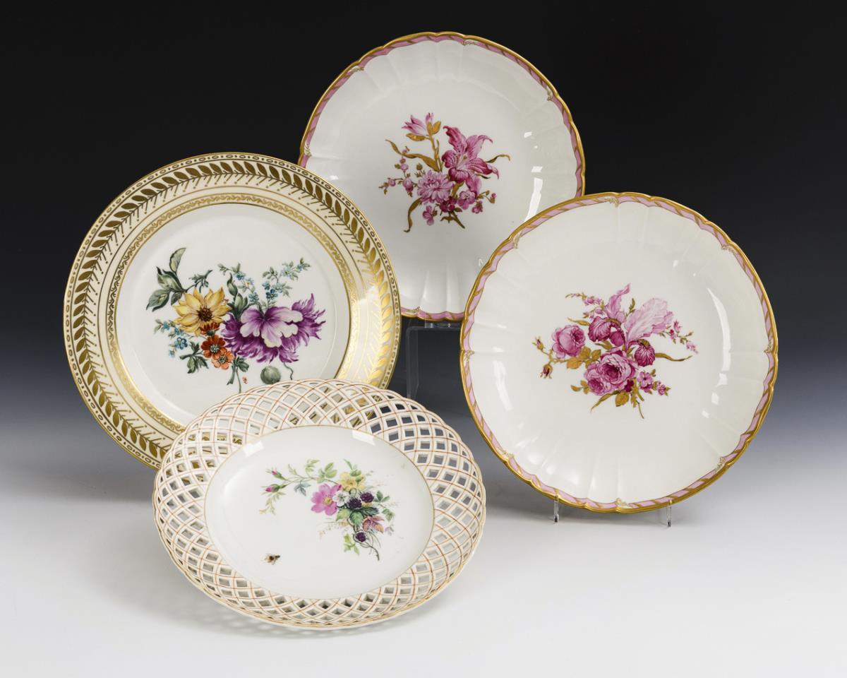 2 "Antikzierat" bowls: with purple and gold floral painting (Ø 24 cm). / 1 "Antique smooth" plate with floral painting and gold painting on the rim (Ø 26 cm). / 1 pierced plate with flower and insect painting (Ø 23.5 cm).