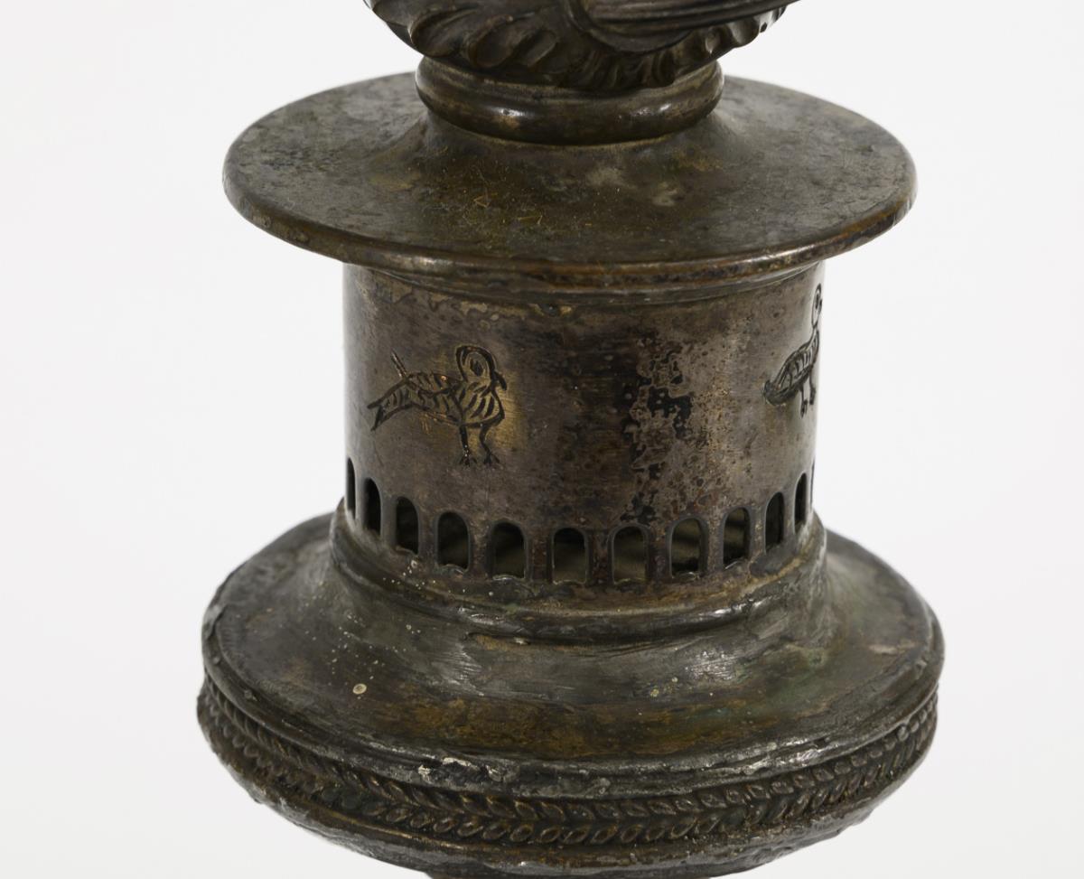 Probably made in Afghanistan according to the European model, with modifications such as pictorial engravings and very large spouts. Foot closed with an iron plate. Soldering marks on the nodus.