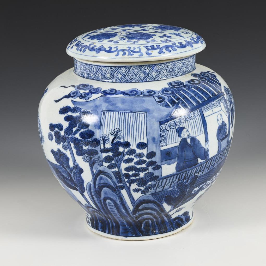 Ceramic vase with surrounding garden depiction and various figures. With a possibly added flat lid with flower and tendril pattern, with a glaze defect in one place.