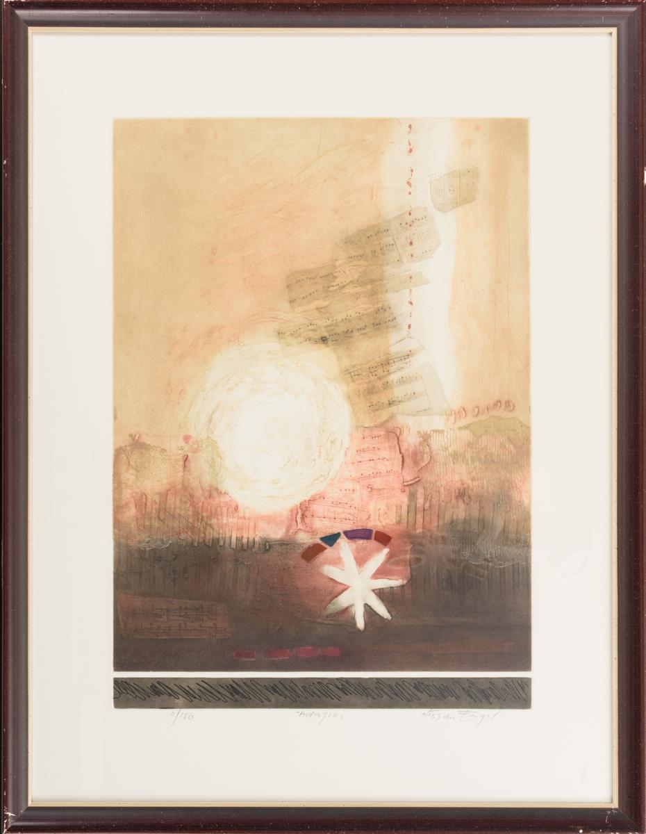 Surrealistisches Werk mit Klaviertasten und Noten.
