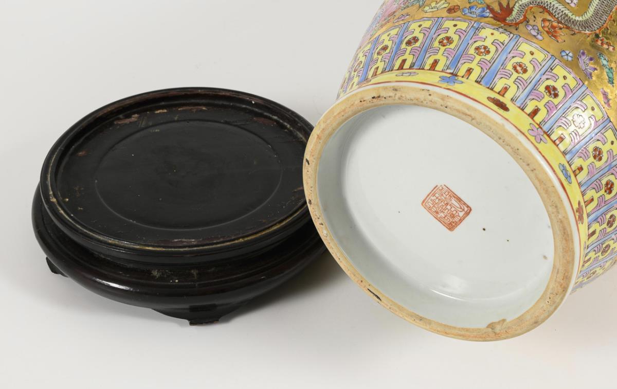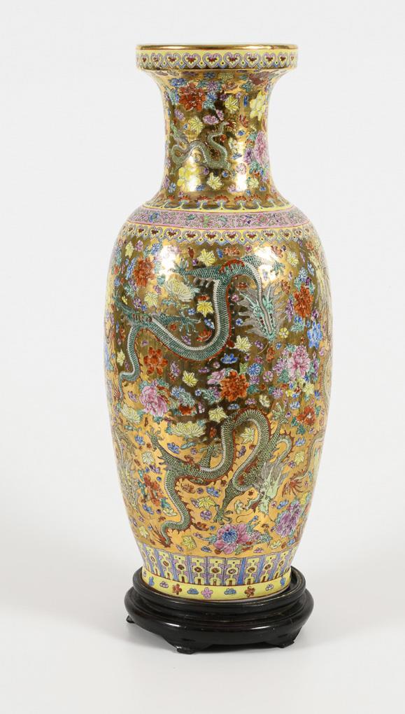 Polychrome painted flowers and dragons on a gold-colored ground. Wooden base.