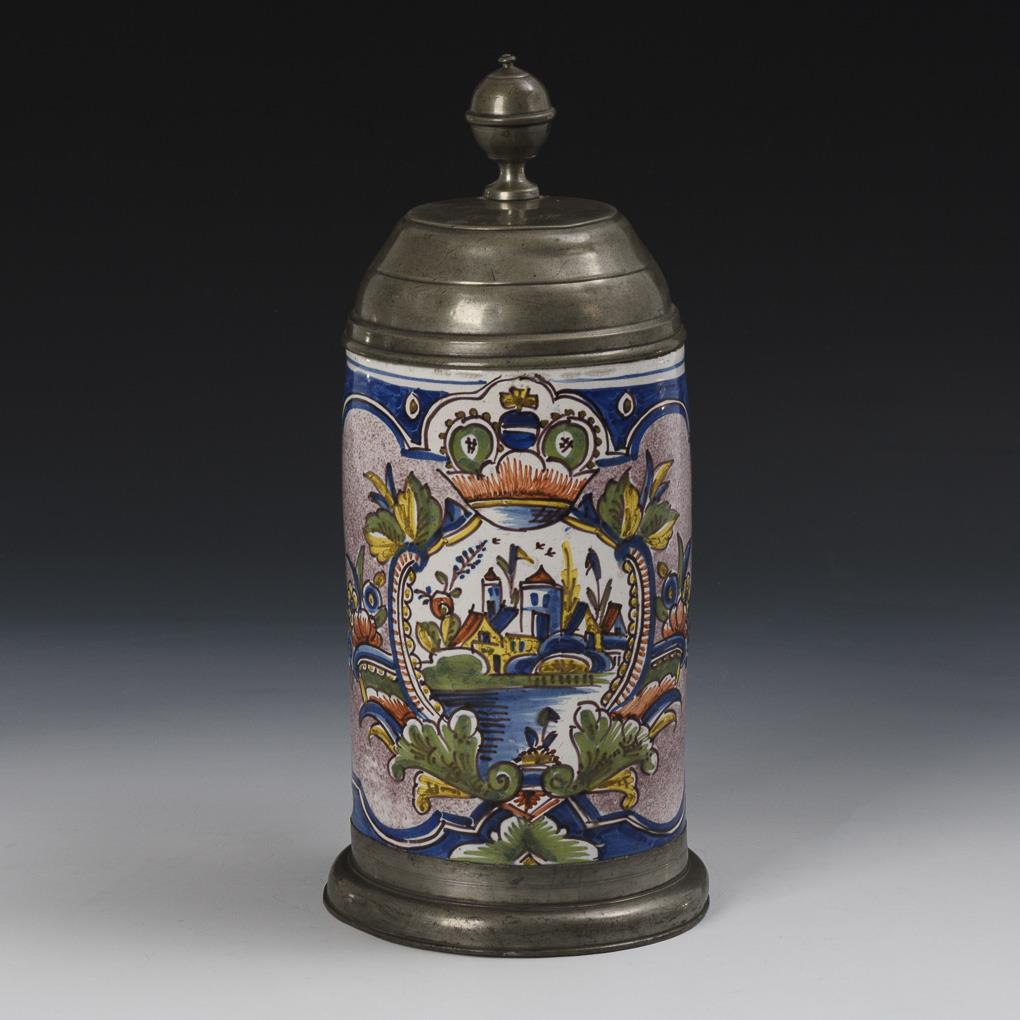 Cylindrical body with strap handle, manganese-painted walls all around, crowned reserve with rocailles and architectural view on the front. Pewter lid with ball finial, engraved "JhK 1808", pewter stand. Wall cracked, slight signs of age and use, slight glaze marks.
